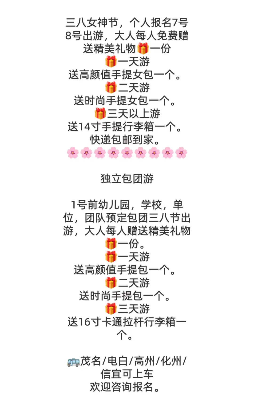 当前位置:首页>美女资讯>三八女神节快乐!!春游豪华空调大巴1-6天 纯玩汽车团,茂名周边游,团建,省外游