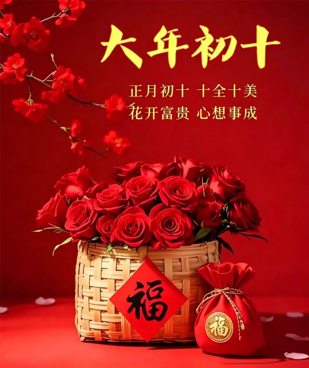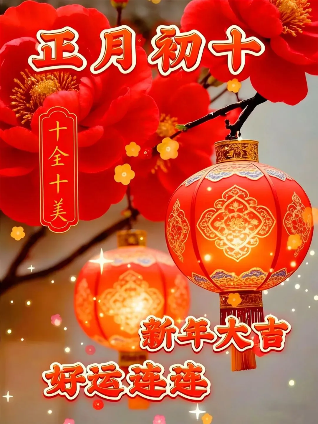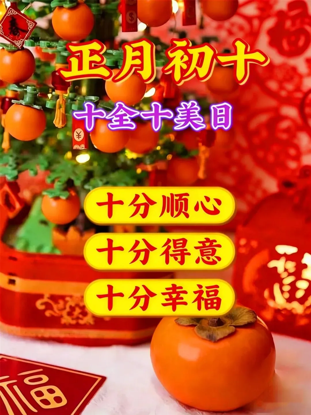 正月初十,十全十美日,喜庆吉祥的好日子,把十全十美的祝福,  送给朋友们! 送上福气、财气和运气,愿收到祝福的朋友: 心想事成!身体健康,万事如意!