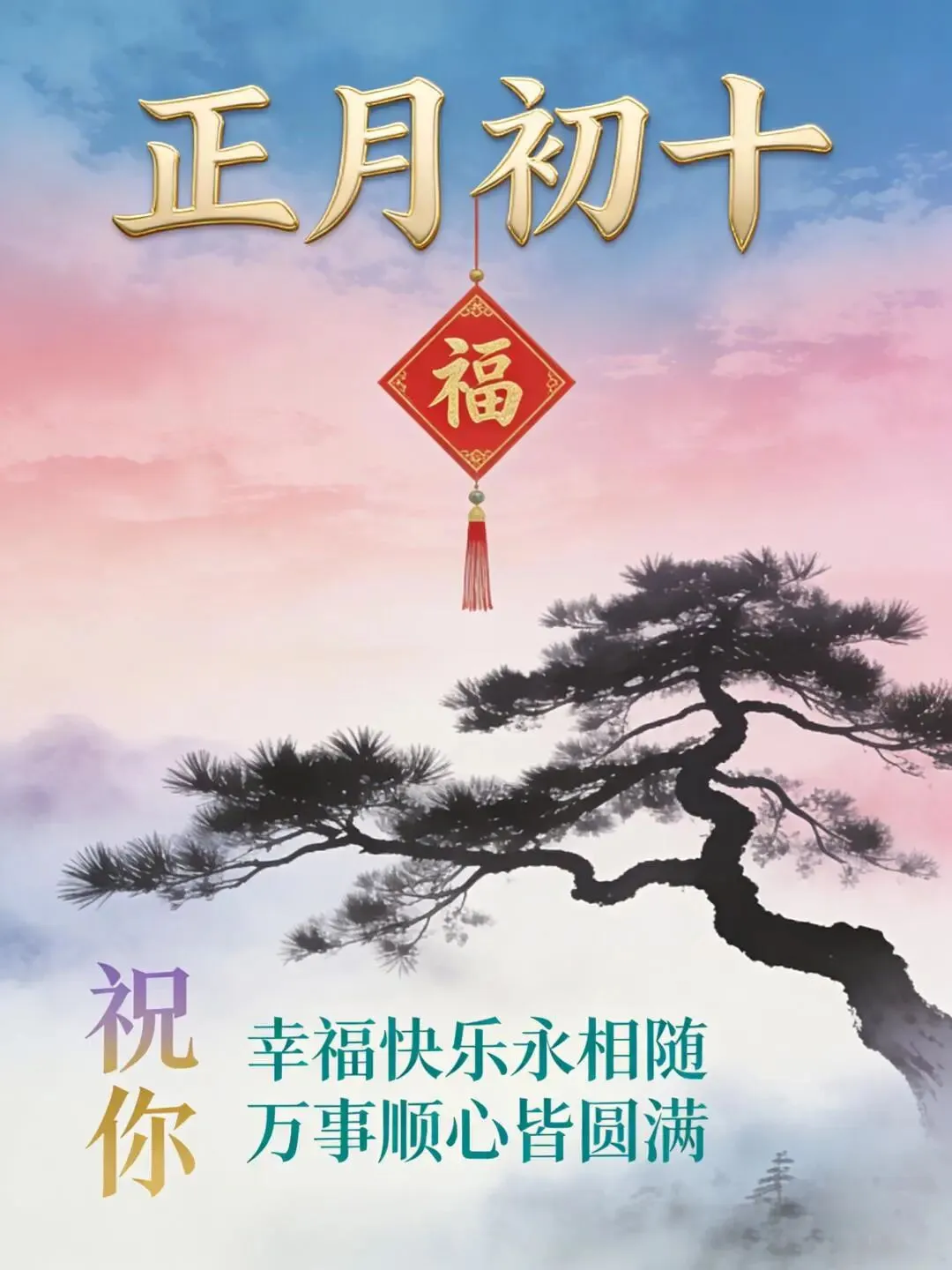 正月初十,美好的日子,送你一份美好的祝福,愿你心有花开,时光芬芳,福星高照,以梦为马,不负热望,不负期待!祝你2026十全十美!