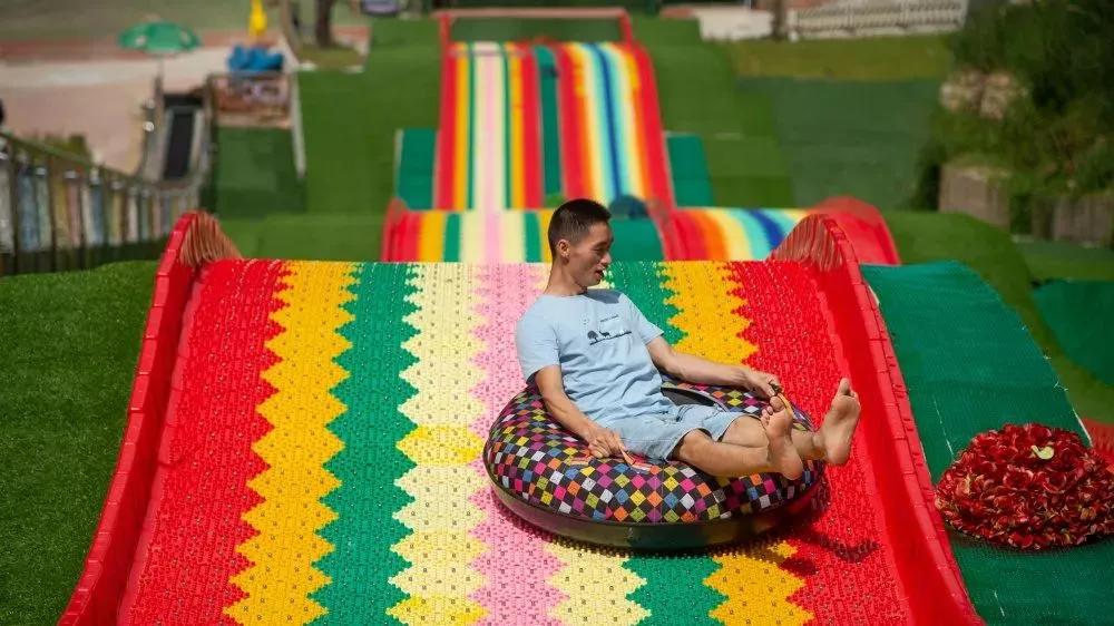 从长长的彩色滑道上面滑下来,尖叫、刺激、欢呼,过瘾!