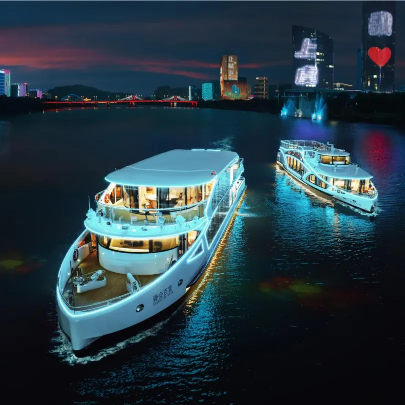 我们的两艘游船——“舜会百官”与“瓷源翠色”,分别可容纳150人和82人团建。“舜会百官”有两层船舱,共有前后4个甲板供您观景;“瓷源翠色”则拥有360°全景甲板,可以让您无死角吹吹江风,非常适合来个甲板音乐会!