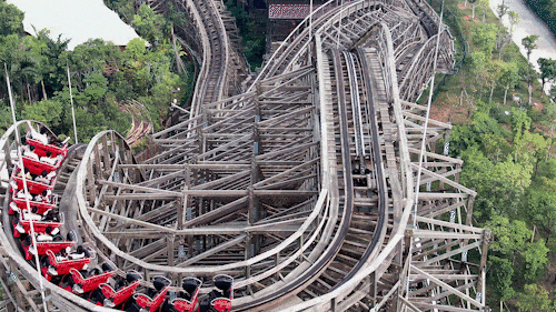 八、《丛林飞龙》Jungle Trailblazer:丛林飞龙以被誉为超级结构用材的美国南方松木为主材,经过防腐、防虫处理,用于构筑过山车的主题结构,可让在极速驰骋中体验木头与车体的完美交融。