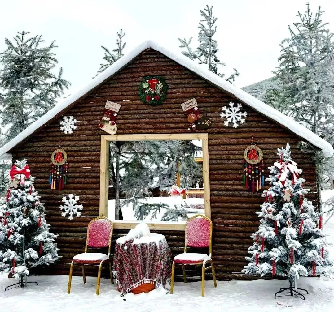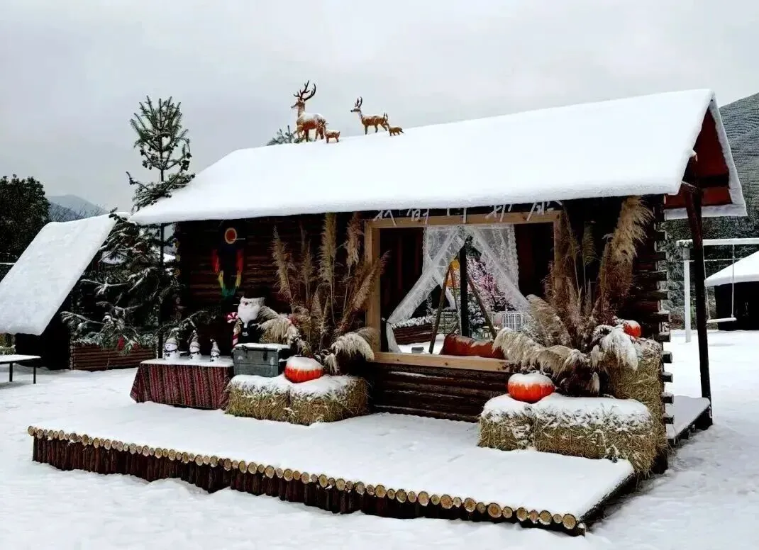 整片场地由积雪、小雪人、木屋以及松树们组成,木屋们错落有致的坐落在雪地上。房顶被厚厚的“积雪”覆盖着 冬日的趣味跃然眼前