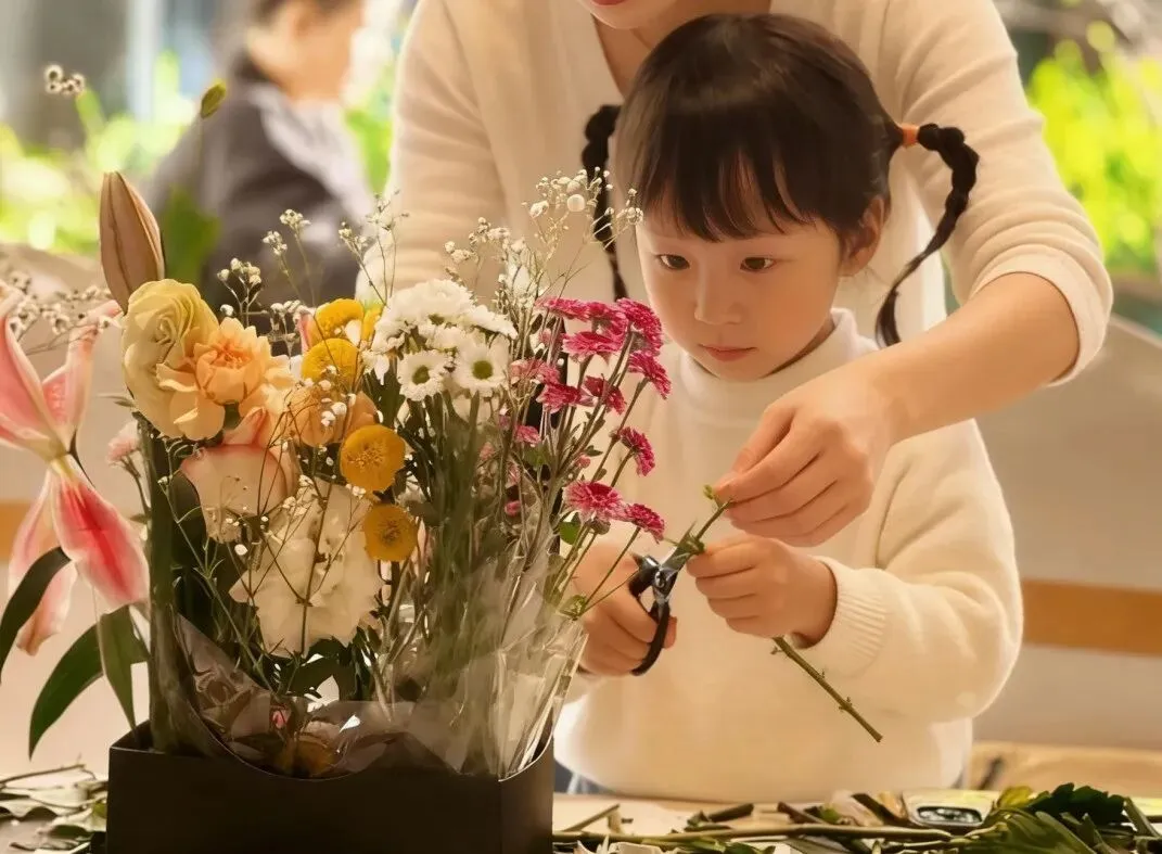 准备新鲜花材,宝妈和孩子一起搭配花束、修剪花枝,完成属于亲子的花艺作品,既能感受花艺的美好,又能留下温馨回忆。