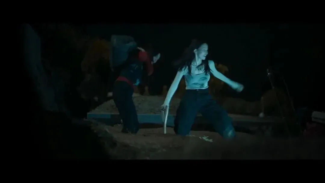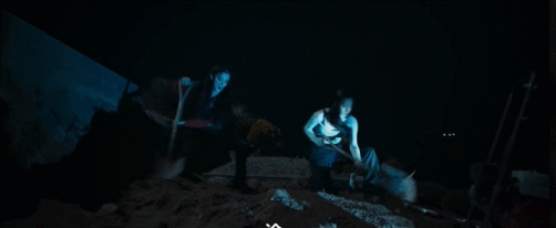 在一个月黑风高的夜晚,两个女孩拿着铲子。