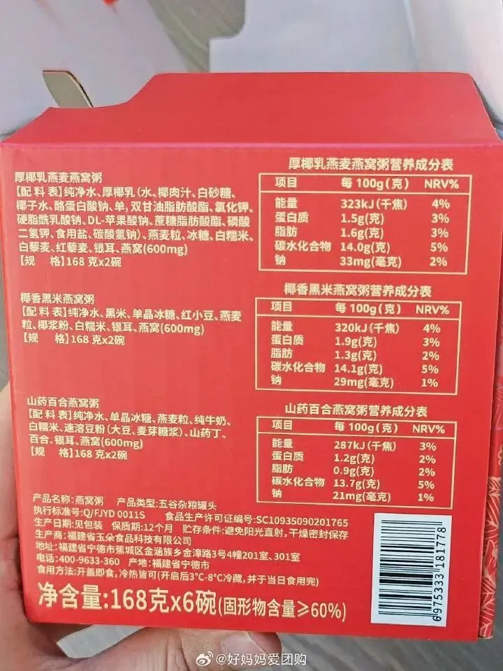 1️⃣厚椰乳燕麦燕窝粥配料:纯净水、厚椰乳(水、椰肉汁、白砂糖、椰子水、酪蛋白酸钠、单,双甘油脂肪酸酯、氯化钾、硬脂酰乳酸钠、DL-苹果酸钠、蔗糖脂肪酸酯、磷酸二氢钾、食用盐、碳酸氢钠)、燕麦粒、冰糖、白糯米、白藜麦、红藜麦、银耳、燕窝