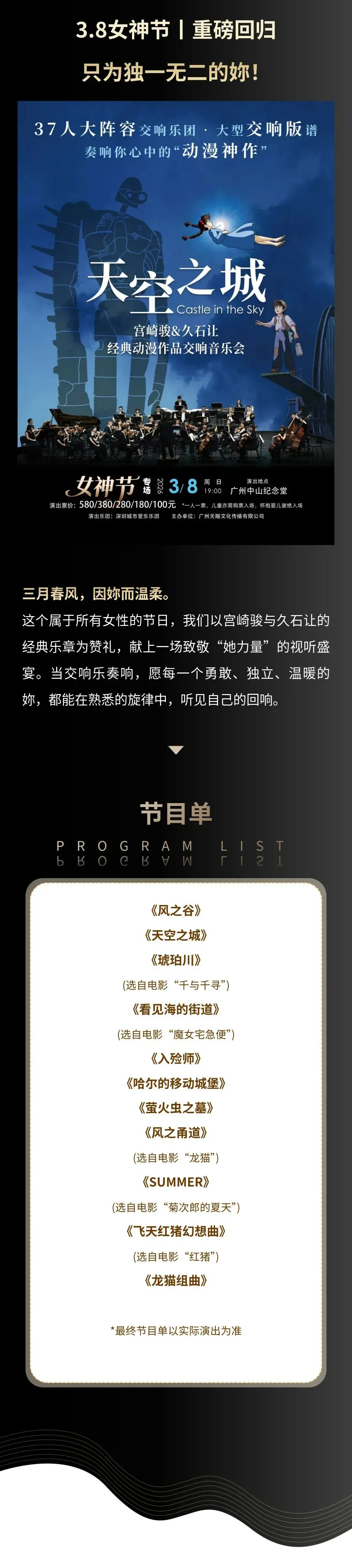 3.8女神节,不送鲜花不送礼物,送你一场治愈又有力量的视听盛宴!当37人交响乐团奏响宫崎骏与久石让的经典乐章,当《天空之城》的旋律萦绕中山纪念堂,每一个勇敢、独立、温暖的妳,都能在熟悉的旋律中,听见自己的回响,邂逅属于自己的温柔与光芒。