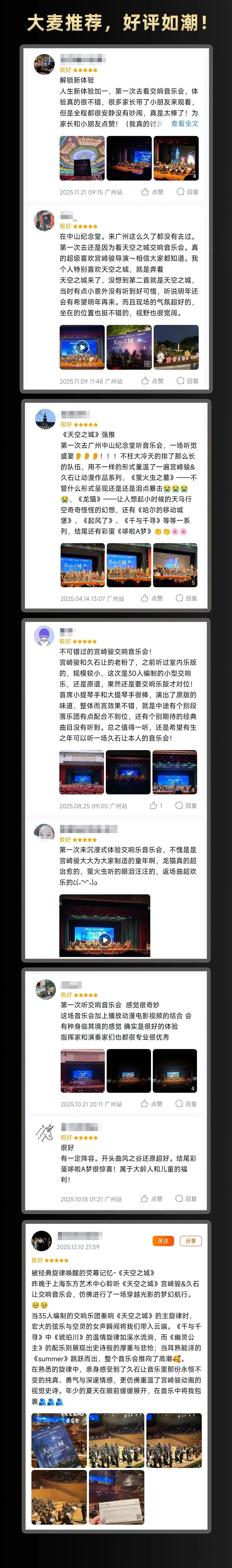 全国巡演100+场,积累了无数好评,大麦超高推荐,观众口碑炸裂!2025年广州站三度加场,中山纪念堂近3000个座位座无虚席,现场掌声不断、好评如潮,不少观众表示“听完热泪盈眶,治愈了所有疲惫”“交响乐版太震撼,比原曲更有感染力”。