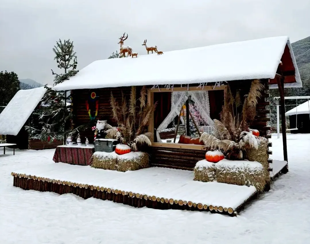 整片场地由积雪、小雪人、木屋以及松树们组成,木屋们错落有致的坐落在雪地上。房顶被厚厚的“积雪”覆盖着 冬日的趣味跃然眼前