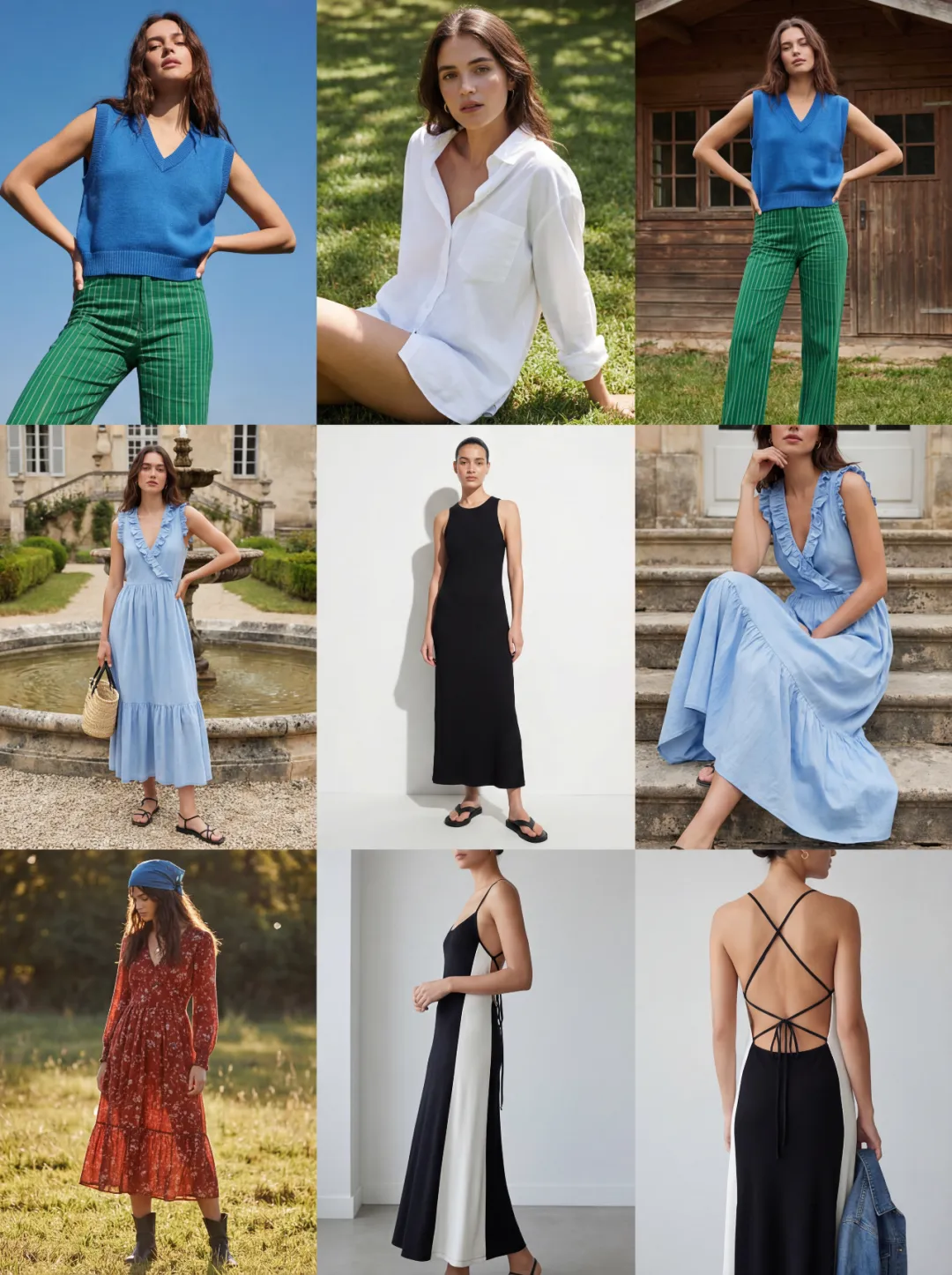 1.一致性控制(重要):为了保证9张图里的模特是同一个人(如果需要的话),建议在Midjourney中使用 --cref (Character Reference) 功能,或者在Stable Diffusion中使用LoRA或ControlNet固定人物特征。如果不需要模特是同一人,则忽略此项。
