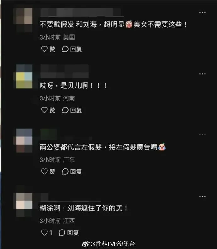 不少网民也表示看不习惯:“看起来很不自然”、“对呀!她做了假发代言?但真的很假哦”、“假发太明显了吧”、“是假刘海”、