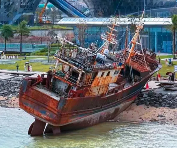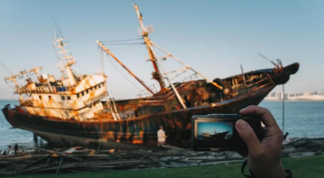 船体锈蚀、姿态倾斜,与海浪相映