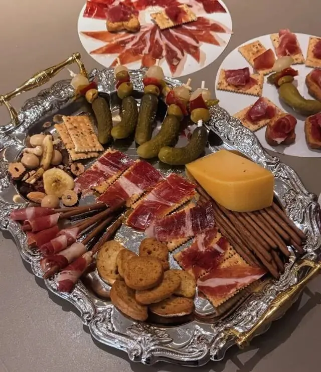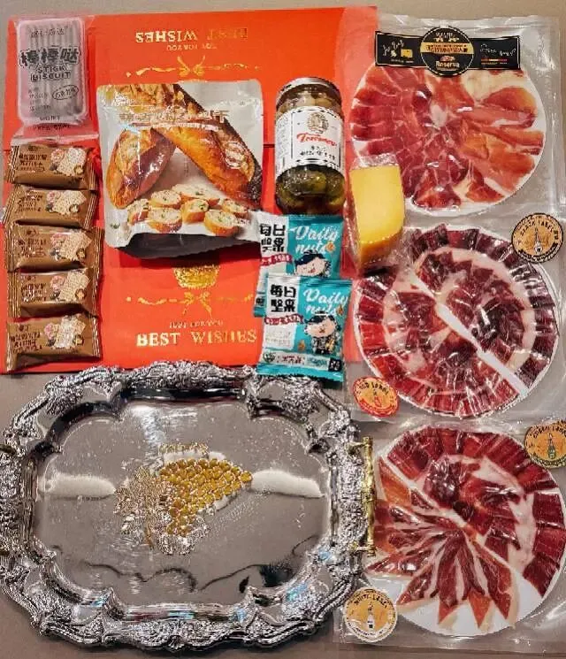 3.外卖、外带五色火腿切片、奶酪、橄榄、面包“在家也能精致”组合附赠银色托盘,即开即食组合套餐优惠价格3XX元/份。(下面👇第二张图片全部产品)。实现在家体验5种不同的火腿风味!西班牙塞拉诺,白标,绿标,红标,黑标。适合老饕和新手小白入门。