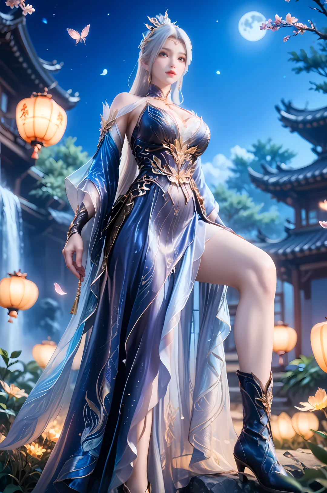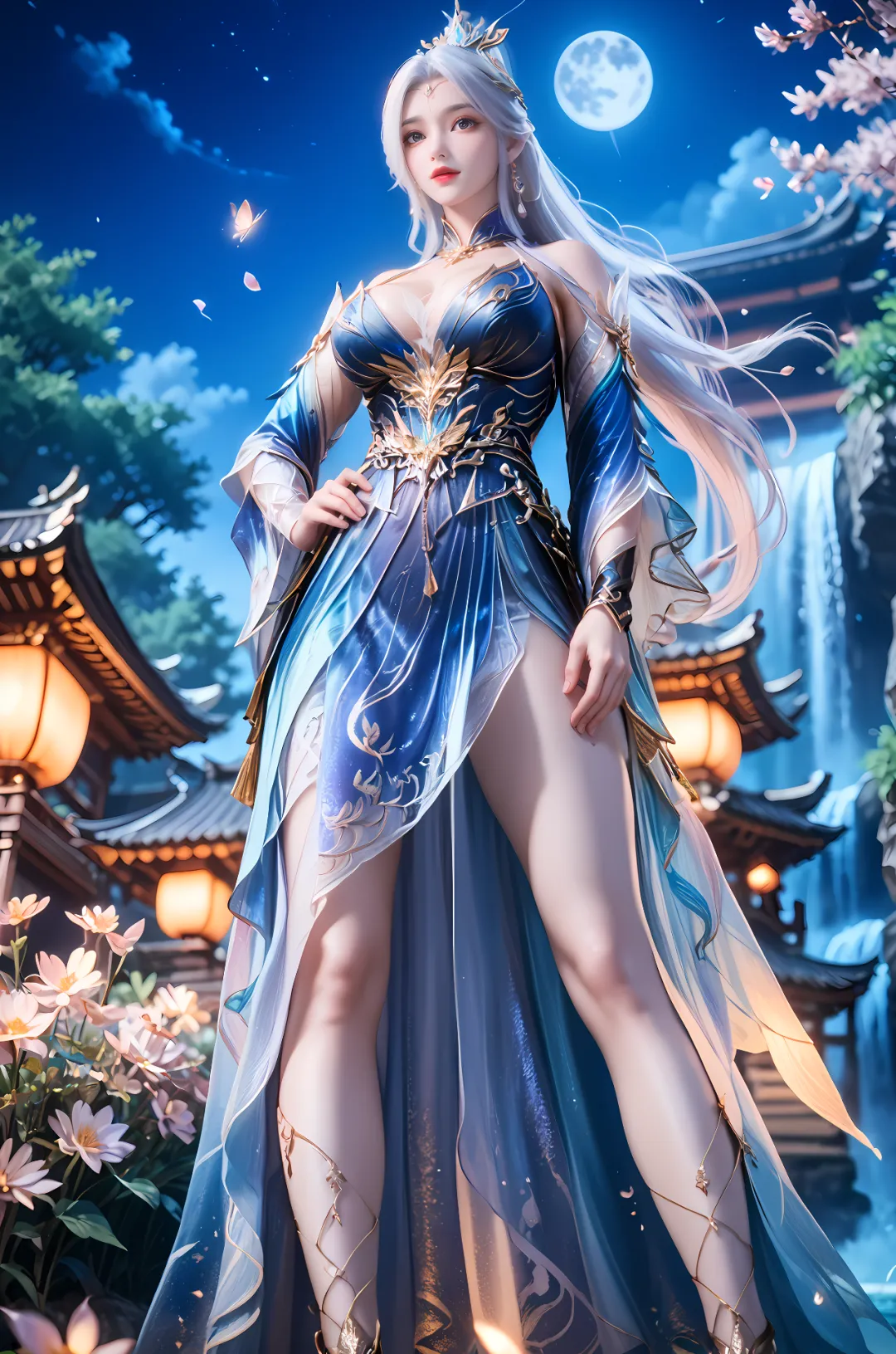 银色长发依旧如银河般璀璨,只是打理得更加整齐,平日里多挽成高贵的发髻,用镶嵌着洛神族秘宝的银色玉冠固定,玉冠上雕刻着繁复的洛神花纹样,既是装饰,也是权力的象征,发间偶尔会点缀少量银色的洛神花饰品,添了几分高贵与神性,不再有年少时的随意,每一处都透着女皇的端庄与威严。这个阶段的她,风华绝代,威严大气,既有洛神血脉的神性,又有执掌一族的底气,清冷依旧,却多了几分担当与坚韧,不再是那个需要被保护的少女,而是能守护洛神族族人的女皇。