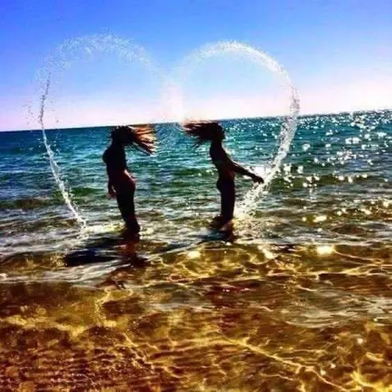这个动作有点难度,不仅需要两个长发闺蜜用力甩头,还要摄影师眼疾手快进行抓拍。一次不能成功,多尝试几次就好了。