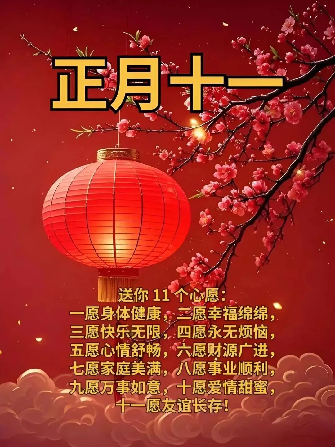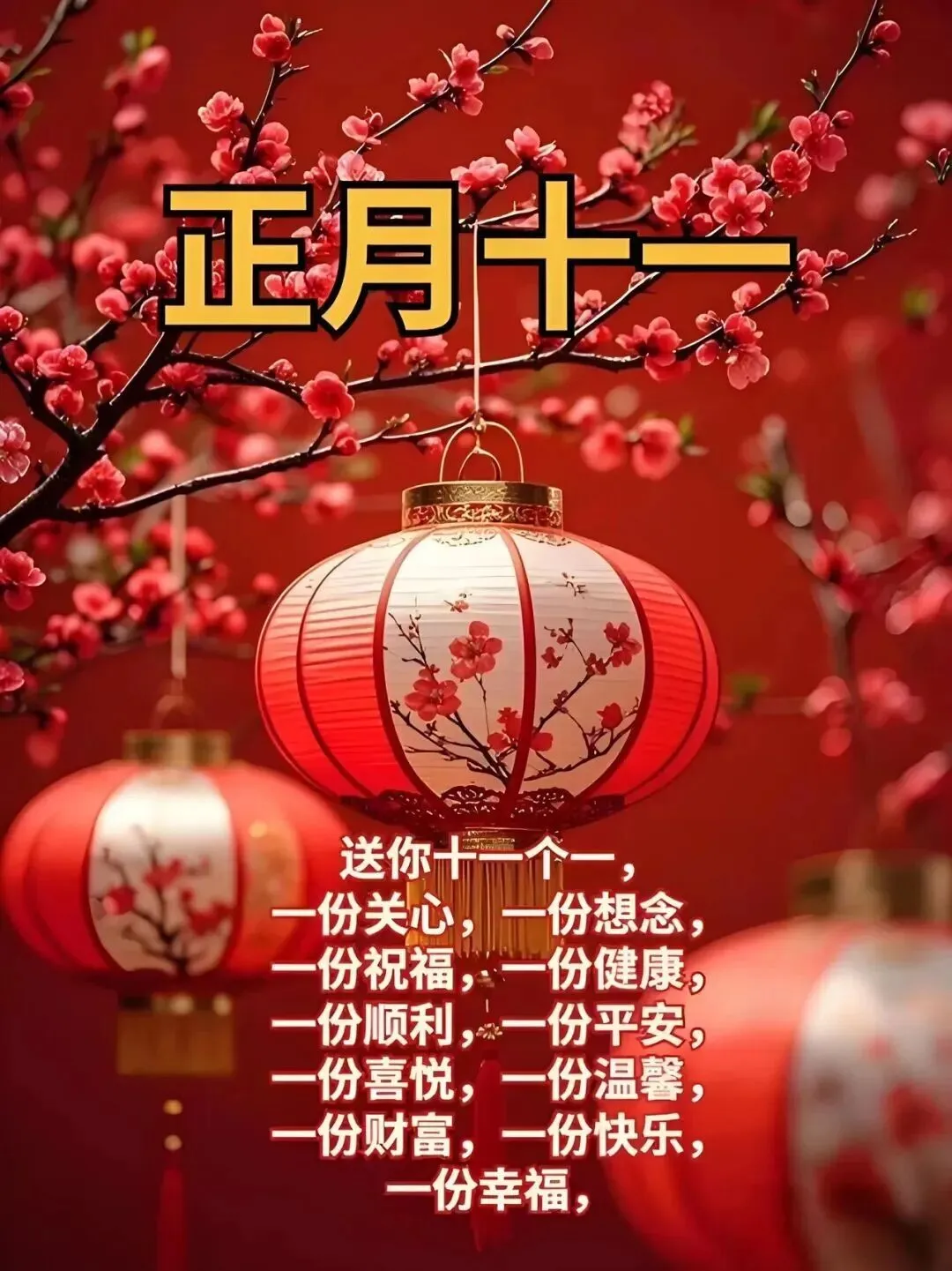🧨 正月十一,送你十一个一,一份关心,一份想念,一份祝福,一份健康,一份顺利,一份平安,一份喜悦,一份温馨,一份财富,一份快乐,一份幸福,十一快乐!🧨🧧