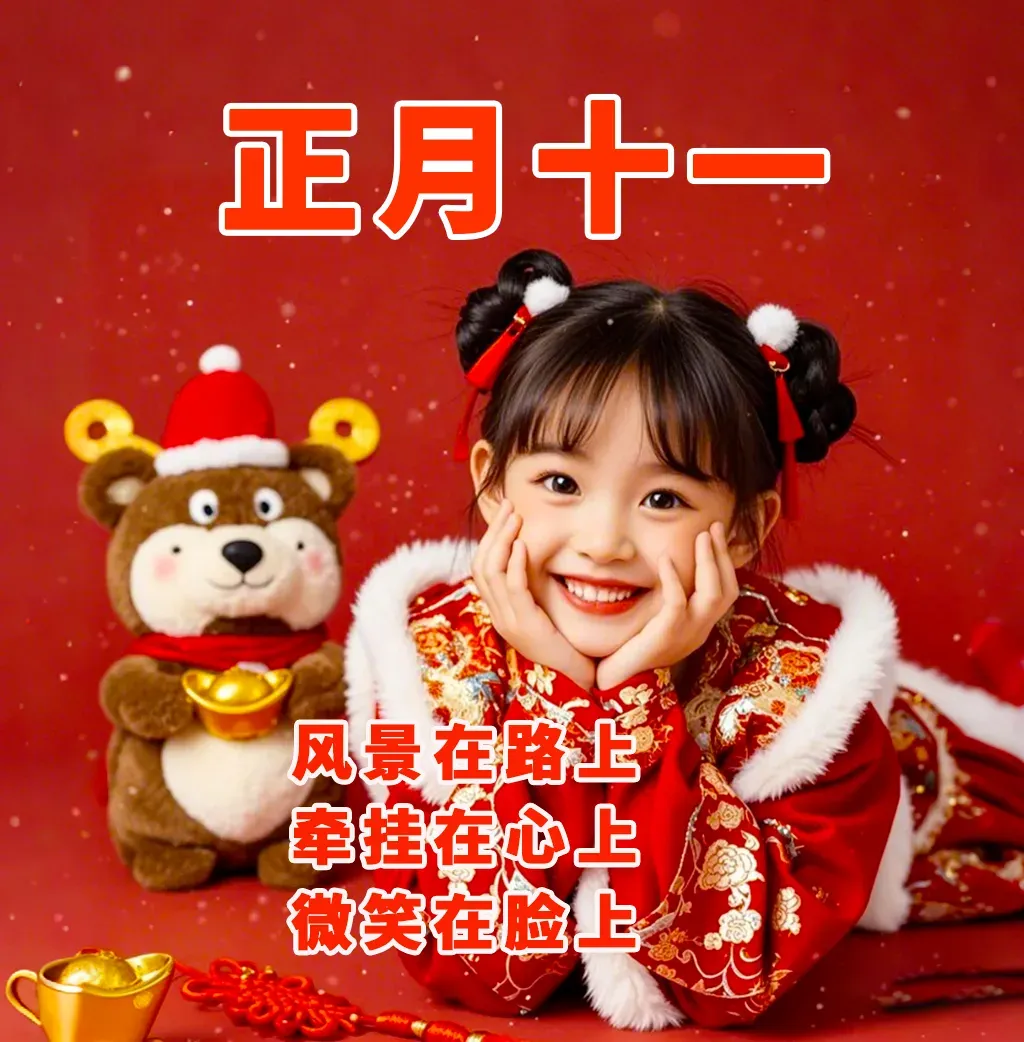 11. 正月十一,问候不晚不早🤗,祝福不多不少🎊,在一心一意的好日子里,祝你机会多多、成本少少,收获多多、烦恼少少😫,分享多多、失意少少,朋友多多、感慨少少,快乐多多😄、郁闷少少!