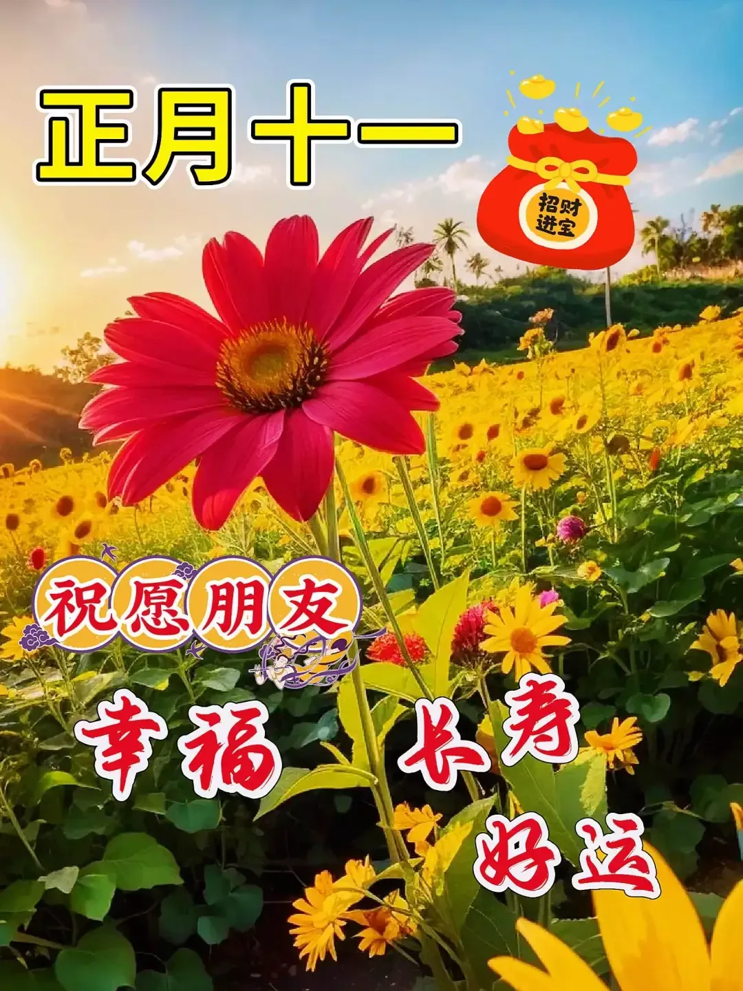5. 正月十一,一生平安🙏,一世健康💪,一心一意,溫馨甜蜜💕,愿你一本万利,财源广进💰,所想所愿,一一实现🎯。今年一定发,一定旺!