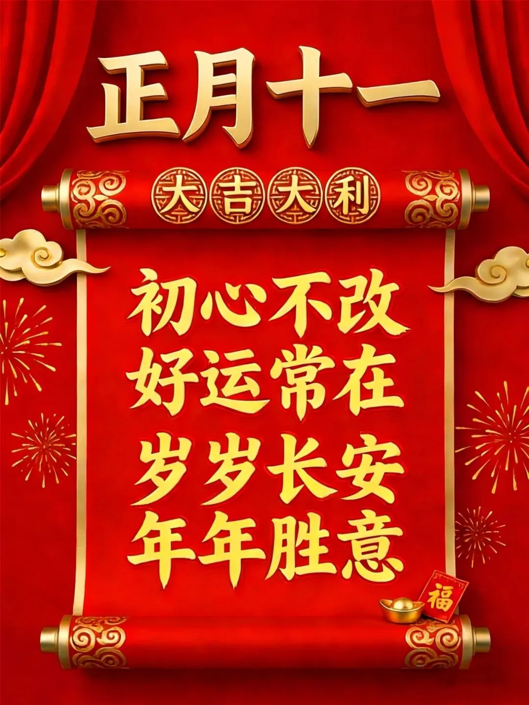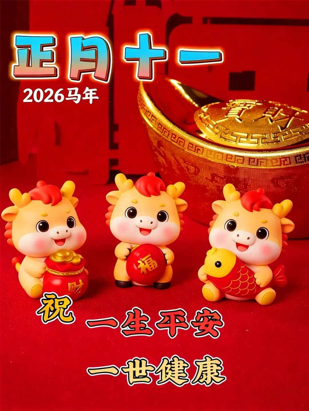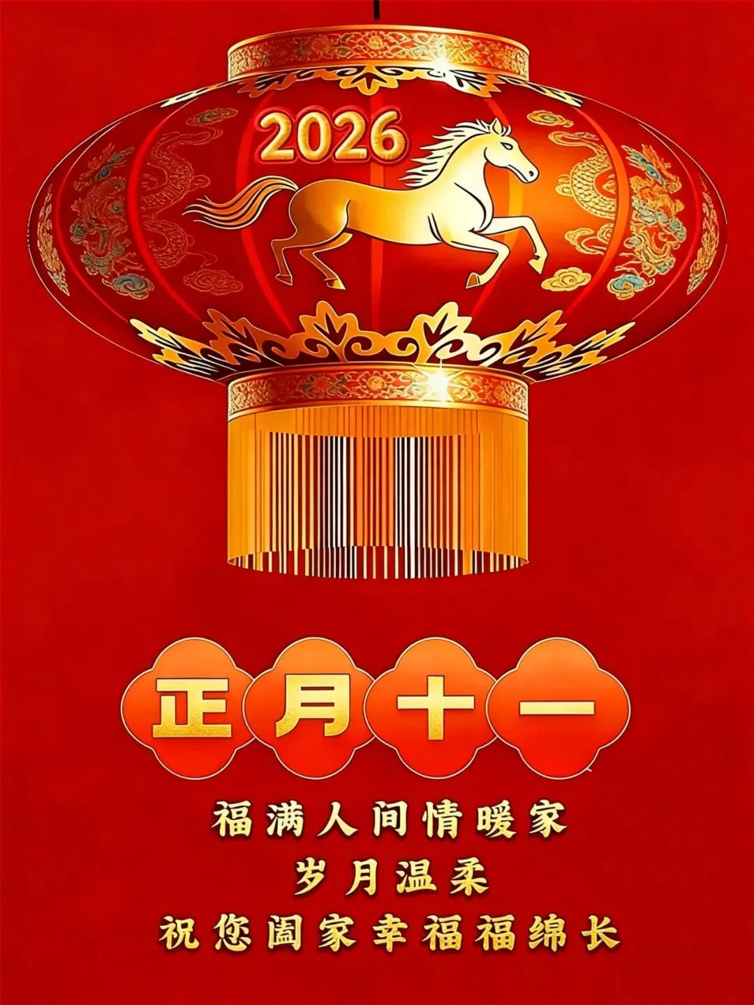 正月十一,一心一意祝福你,愿马年春风得意,一马当先奔向美好,一朝一夕皆顺利,一分一秒皆欢喜,愿2026金马送财,好运连连,万事胜意!