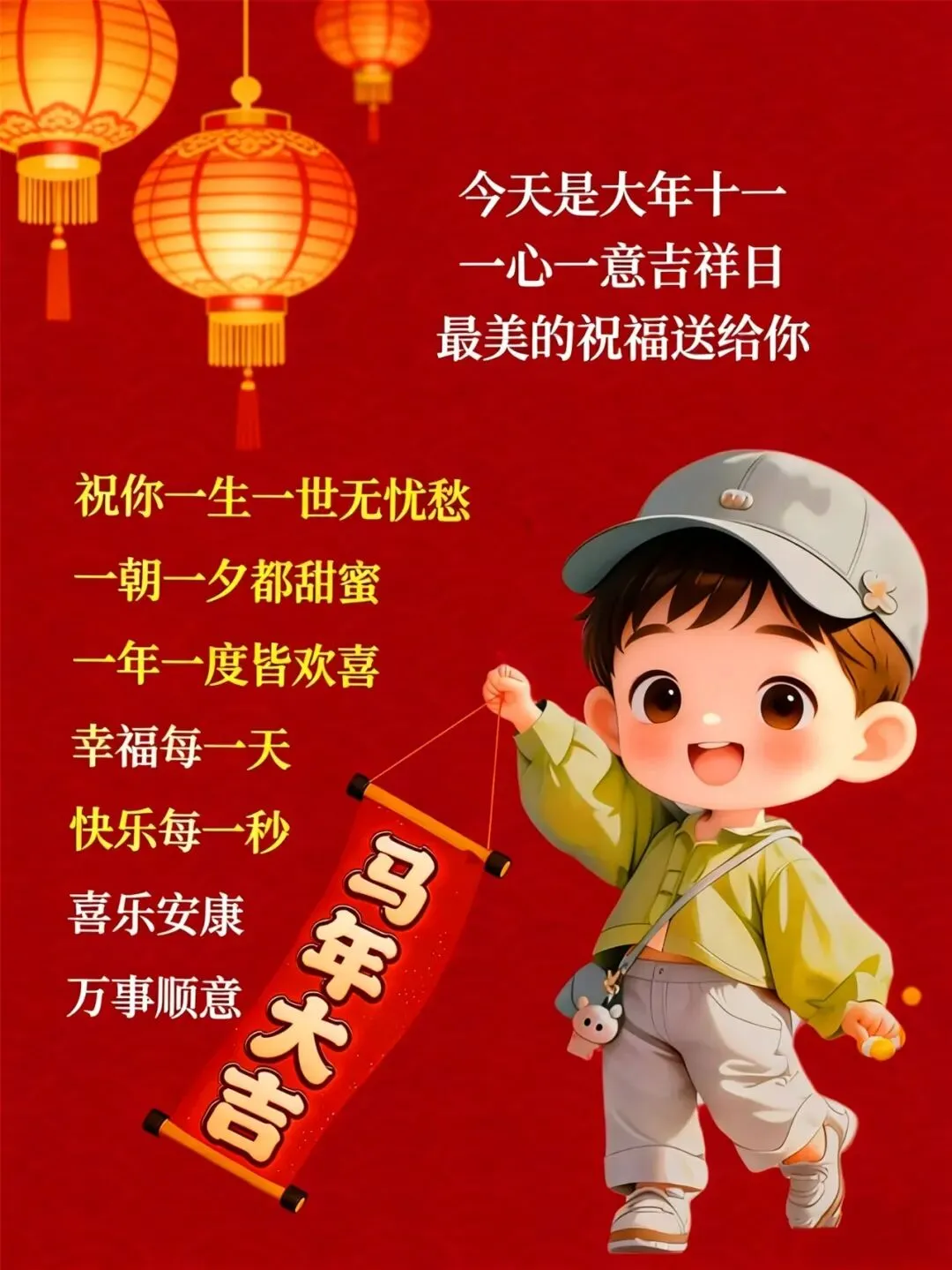 大年初十一,福气正当时!一心一意祝福你,马年万事皆顺意。一生一世无忧愁,岁岁年年皆欢喜,愿你日子红火,心中有光,脚下有路,马到成功!