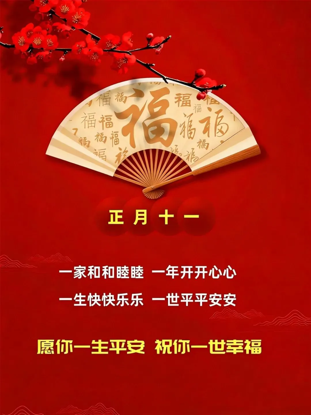 今天是正月十一,愿你一家,都和和睦睦,一年,都开开心心,一生,都快快乐乐,一世,都平平安安,天天都信心十足,月月都精神百倍,年年都顺风顺水,世世都顺心顺意!