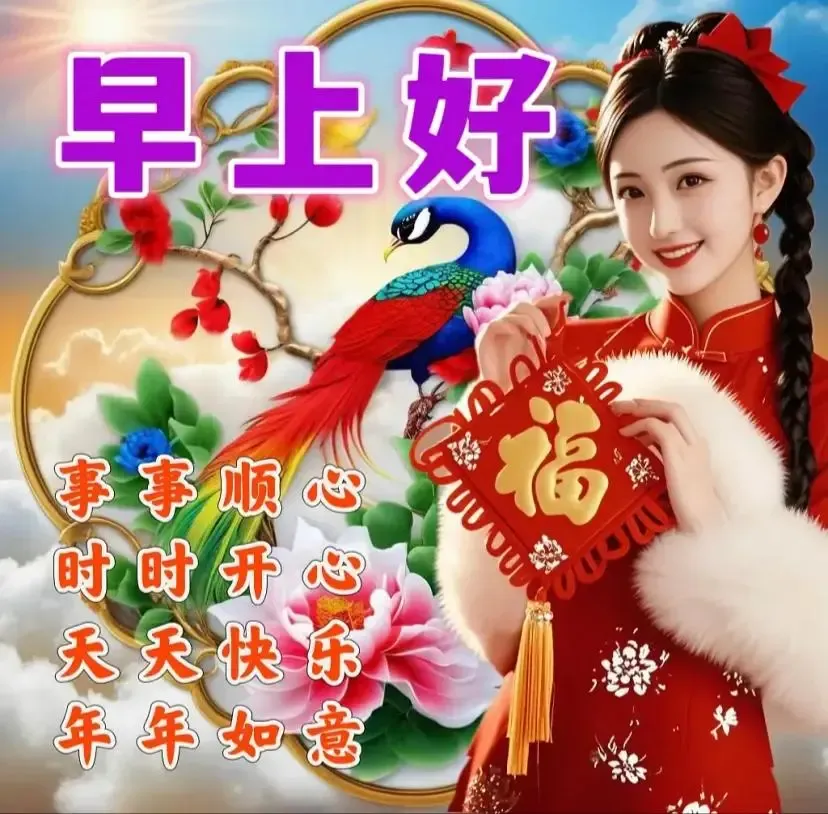 打开的是福临门;看到的是福禄寿;收到的是福五娃;撞到的是福星运;盼到的是福满仓;来到的是喜庆年。早安吉祥!新的一天,好运多多,凡事皆圆满!