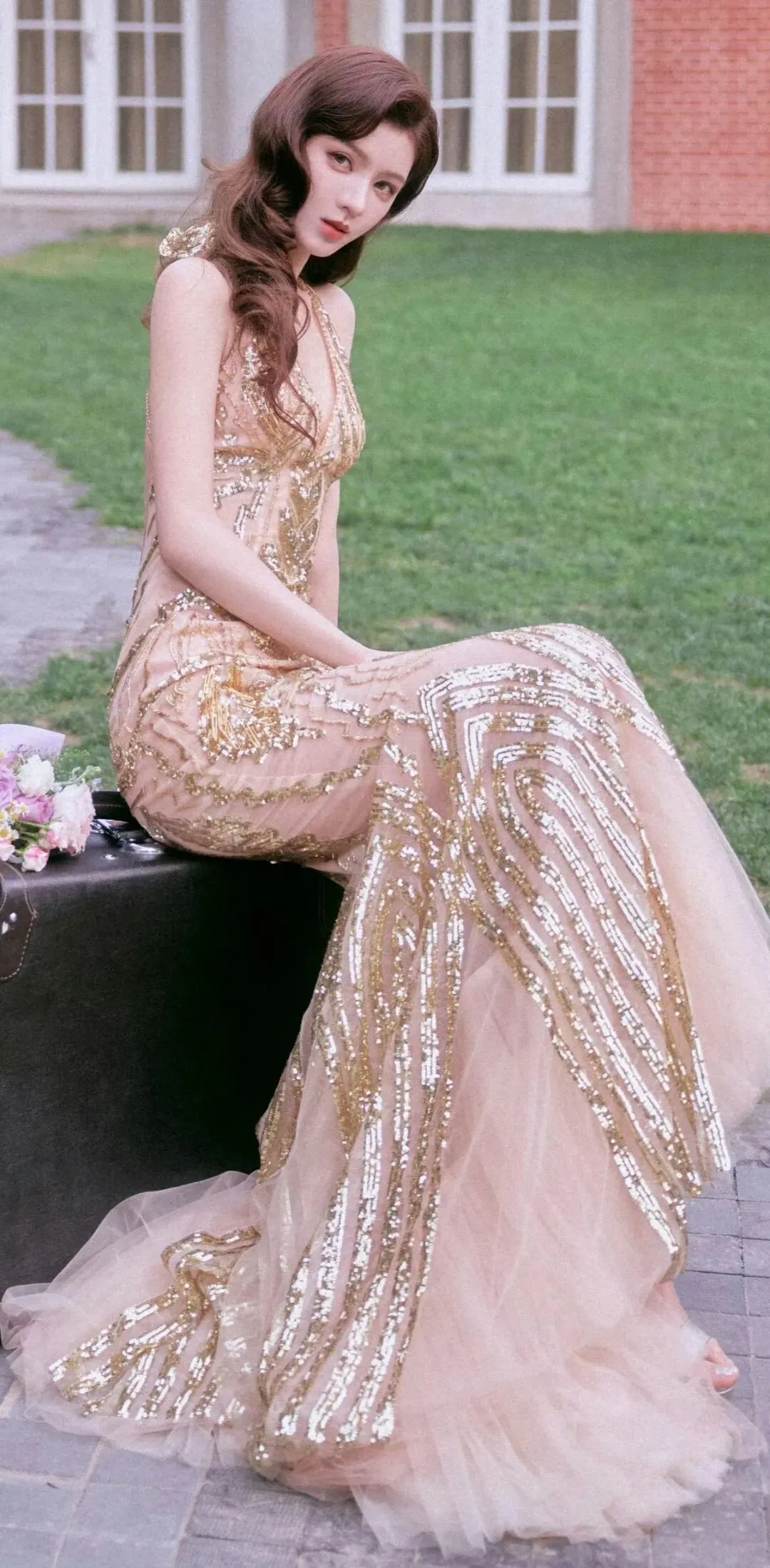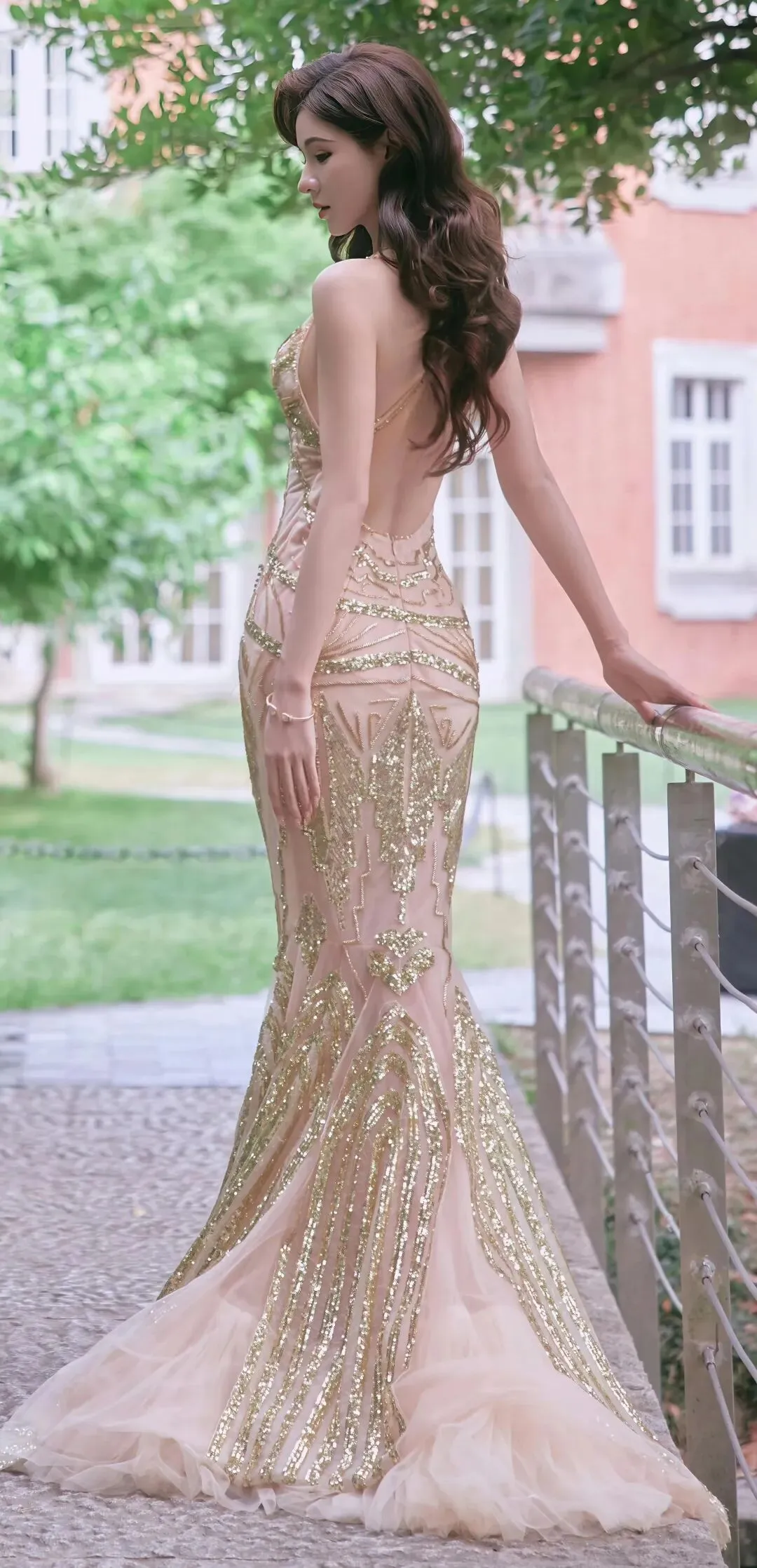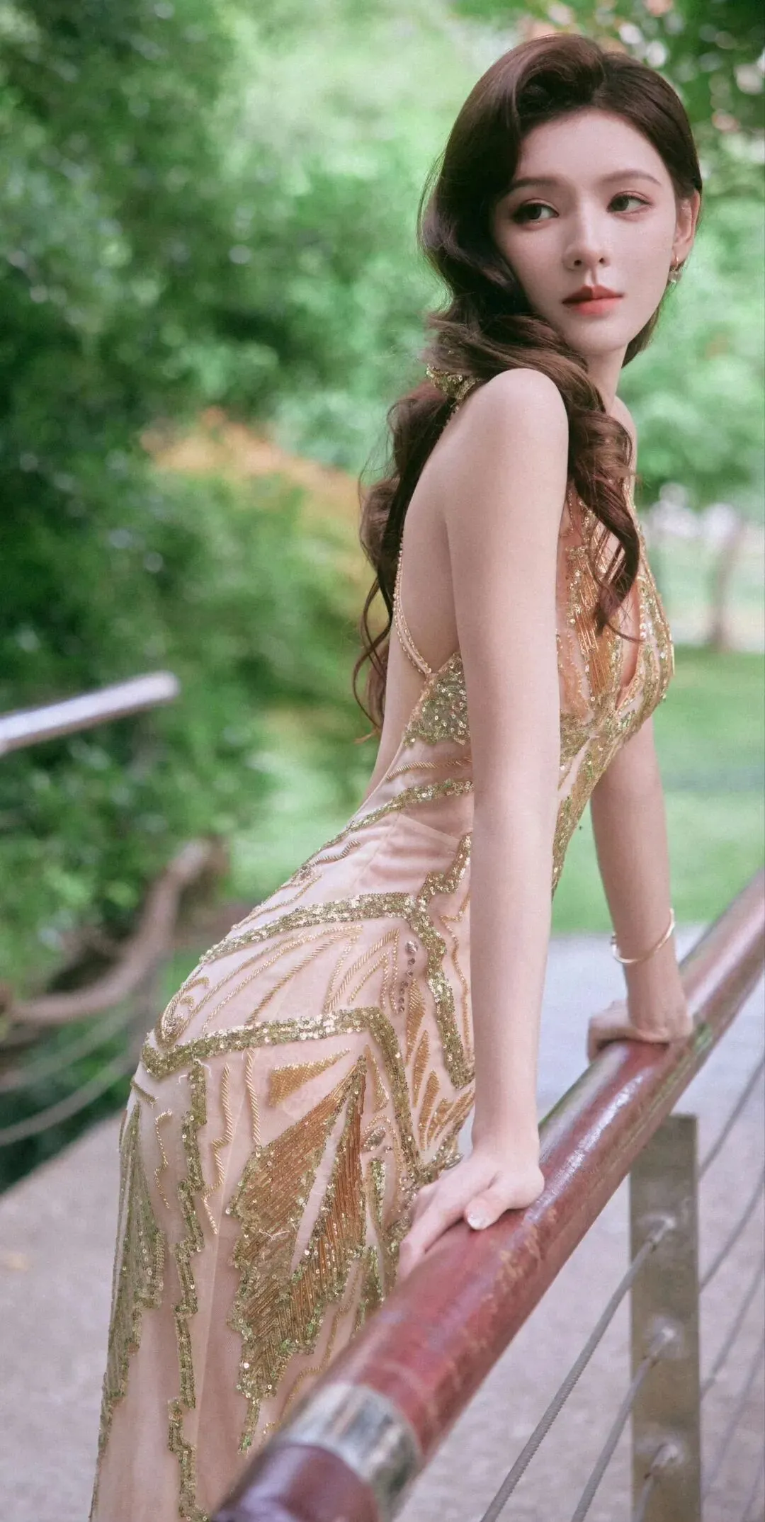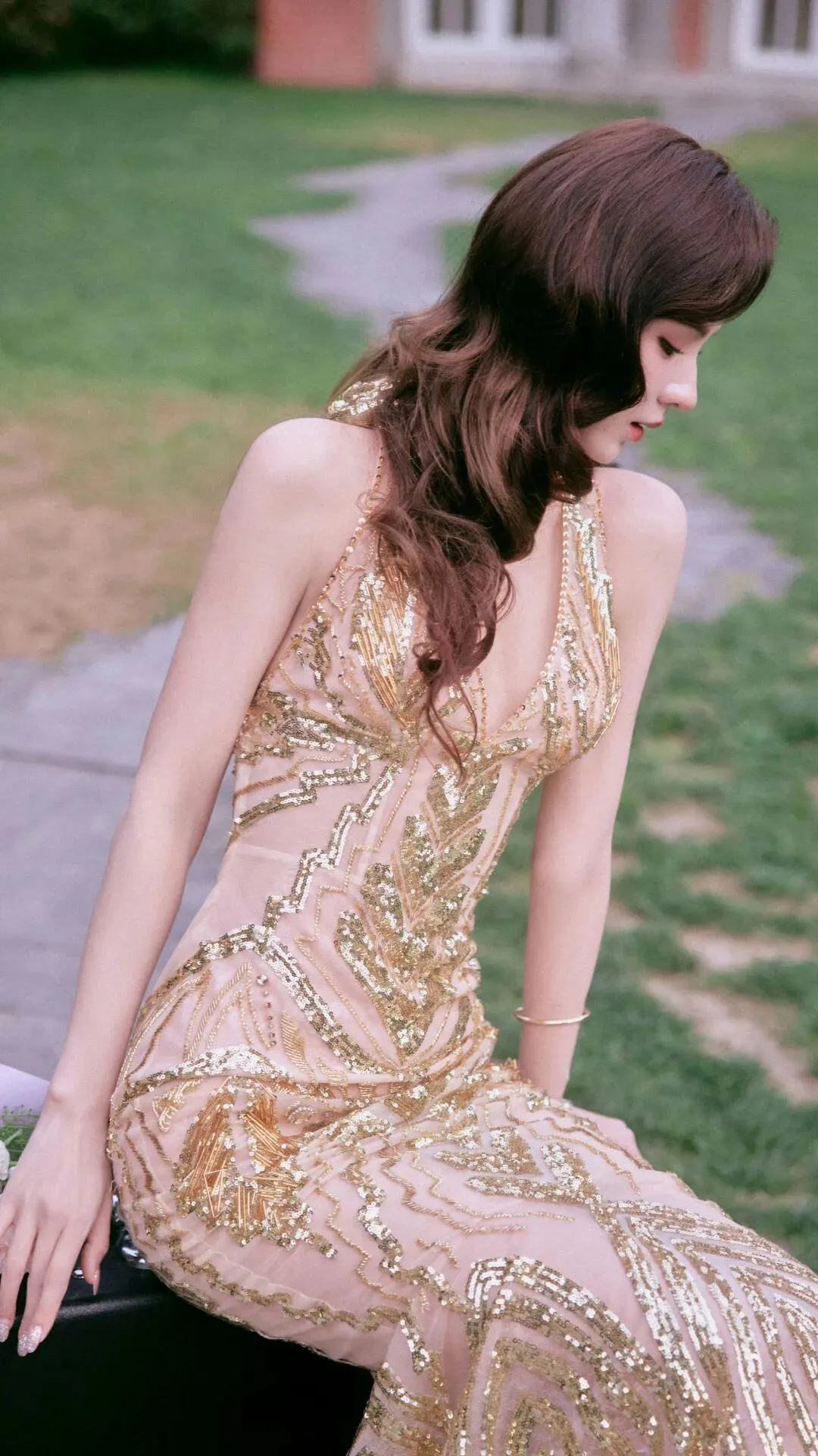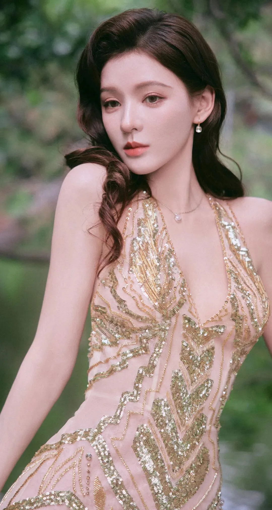 光影之下,她的肌肤如绸缎般泛着柔光,与礼服的质感相得益彰。