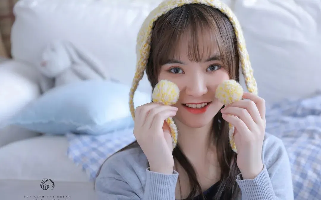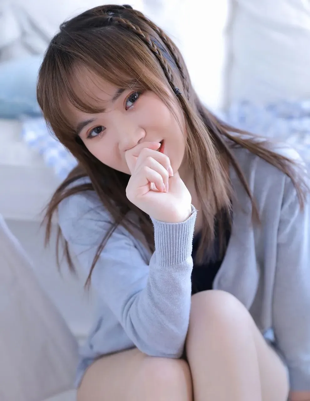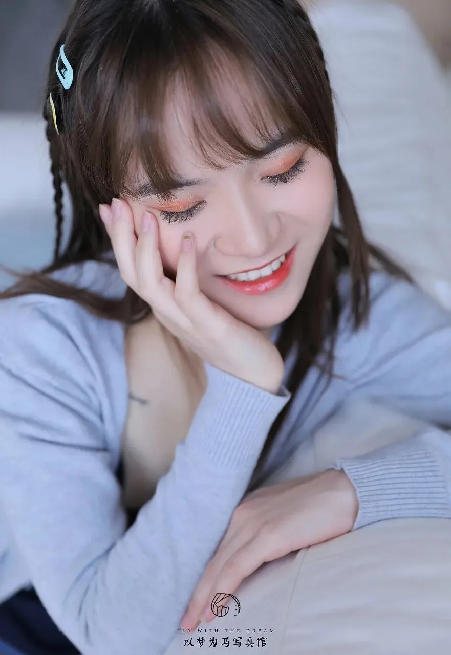 在生活的喧嚣与纷扰中,我们总在寻觅一方宁静的天地,能让心灵得到片刻的休憩。而当看到这位少女恬静地倚靠在柔软的沙发上,那一抹温柔的微笑如同一束光,照亮了这平凡的瞬间,让我们感受到了生活中那些被忽略的美好。少女的头发柔顺地披散在肩头,几缕发丝被精心编成了辫子,用浅蓝色的发卡固定,增添了几分俏皮与灵动。她的刘海整齐而自然,轻轻拂过眉眼,更显温婉。她身着一件浅灰色的针织开衫,质地柔软而舒适,仿佛带着阳光的温暖。开衫的线条简洁流畅,衬托出她纤细的身姿。她的妆容精致而淡雅,橙色的眼影如同春日里的暖阳,为她的眼眸增添了一抹明亮的色彩;红润的嘴唇微微上扬,露出一口洁白整齐的牙齿,笑容灿烂而甜美,仿佛能融化人心。此刻,她侧卧在浅色的沙发上,右手轻轻地托着脸颊,左手自然地搭在沙发上,姿态慵懒而惬意。她的双眼微闭,长长的睫毛如蝴蝶的翅膀般轻轻颤动,仿佛沉浸在一个美好的梦境之中。那笑容里,藏着无尽的满足与安宁,让人不禁好奇,是什么样的思绪让她的脸上绽放出如此动人的光彩。