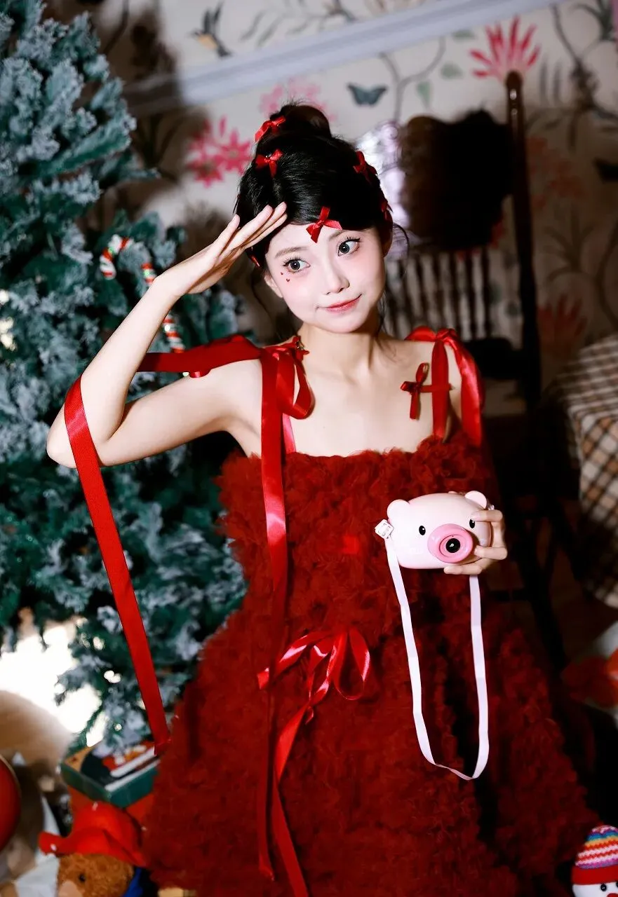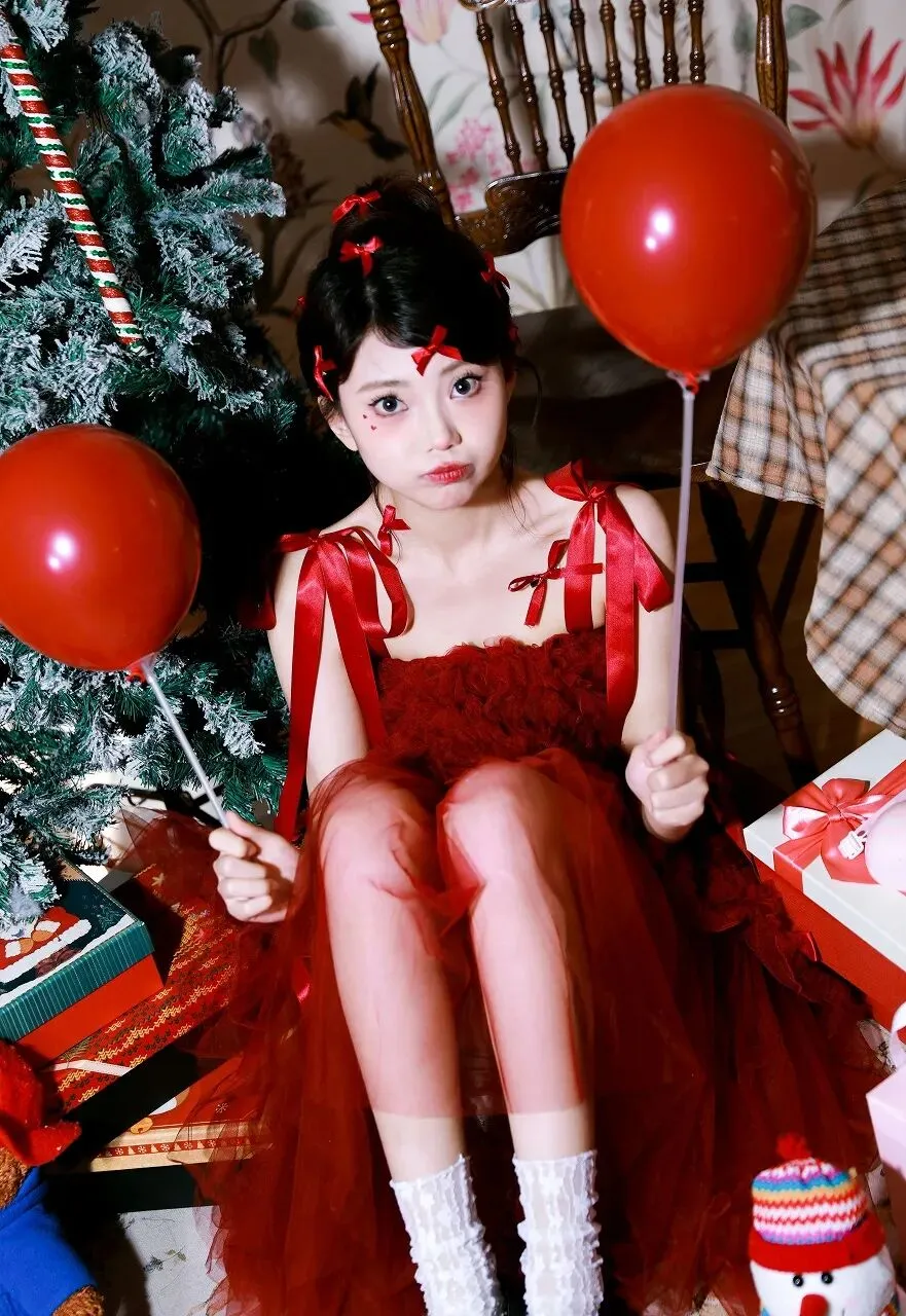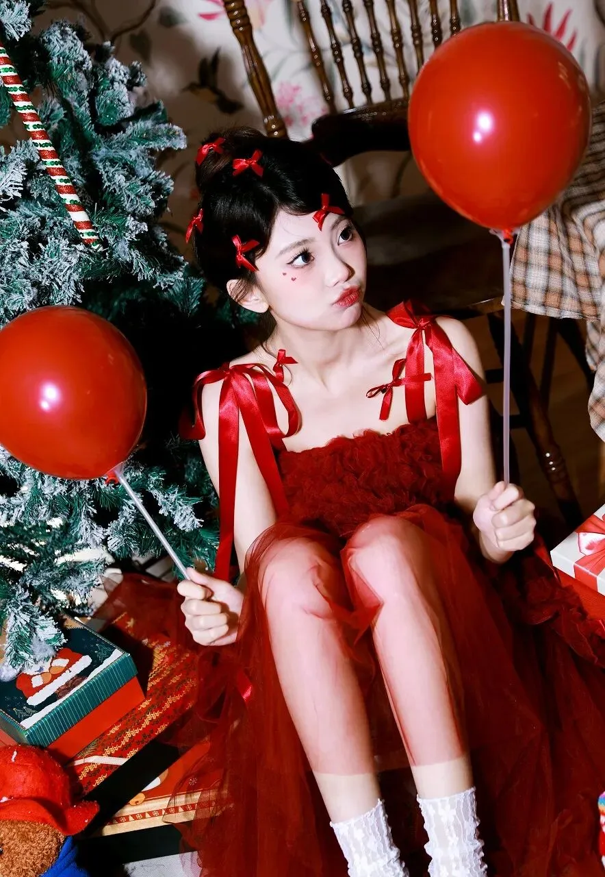 她的妆容精致而富有节日气息,脸颊上点缀着红色的小爱心,如同冬日里的梅花,俏皮又可爱。嘴唇涂着鲜艳的红色口红,与身上的红裙相得益彰,笑容甜美而灿烂,仿佛能驱散冬日的寒冷,带来无尽的温暖。她的眼神明亮而灵动,透露出对节日的期待与喜悦,让人不禁沉浸在这份欢乐的氛围中。圣诞节,这个源自西方的节日,如今已成为了全球欢庆的盛典。它不仅仅是一个宗教节日,更是一种文化的传承与情感的寄托。在这一天,人们会精心装饰圣诞树,互赠礼物,共享美食,表达对彼此的关爱与祝福。而这位红衣少女,就像是圣诞节的使者,用她的美丽与欢乐,传递着节日的温暖与美好。对于少女来说,这个圣诞节或许有着特别的意义。她可能正与家人一起度过这个温馨的节日,享受着团聚的快乐;也可能在与朋友庆祝,分享着彼此的喜悦与梦想。她手中的红气球,或许代表着她对未来的美好期许,希望生活如同这气球一般,充满希望与活力,飞向更高的天空。