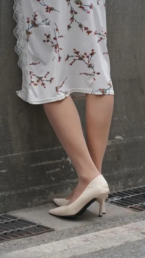 .鞋子.的搭配更是.点睛之笔.。米色缎面.高跟鞋,粗.跟设计走.路稳当,.颜色和.旗袍的白色.呼应,又比纯.白柔和.。穿旗袍不.一定要.配绣花.鞋,.这种现代感的.高跟鞋反.而更显气质.