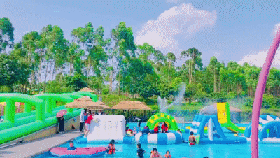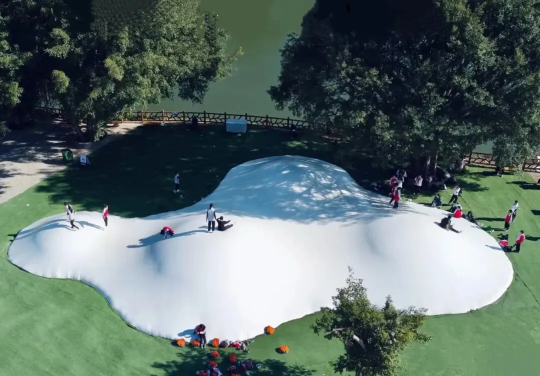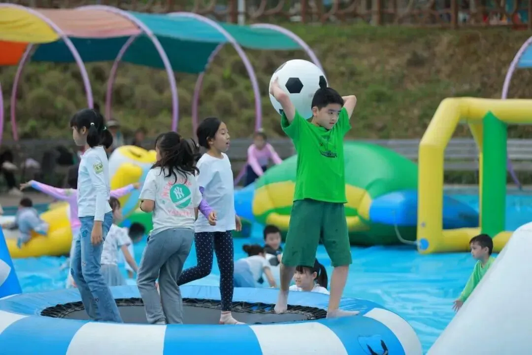 在湖面铺了一层布,踩在水床上,深一脚浅一脚,摇摇晃晃,孩子们之间互相玩闹,笑得畅快淋漓;抛开一切烦恼,全身心放松。