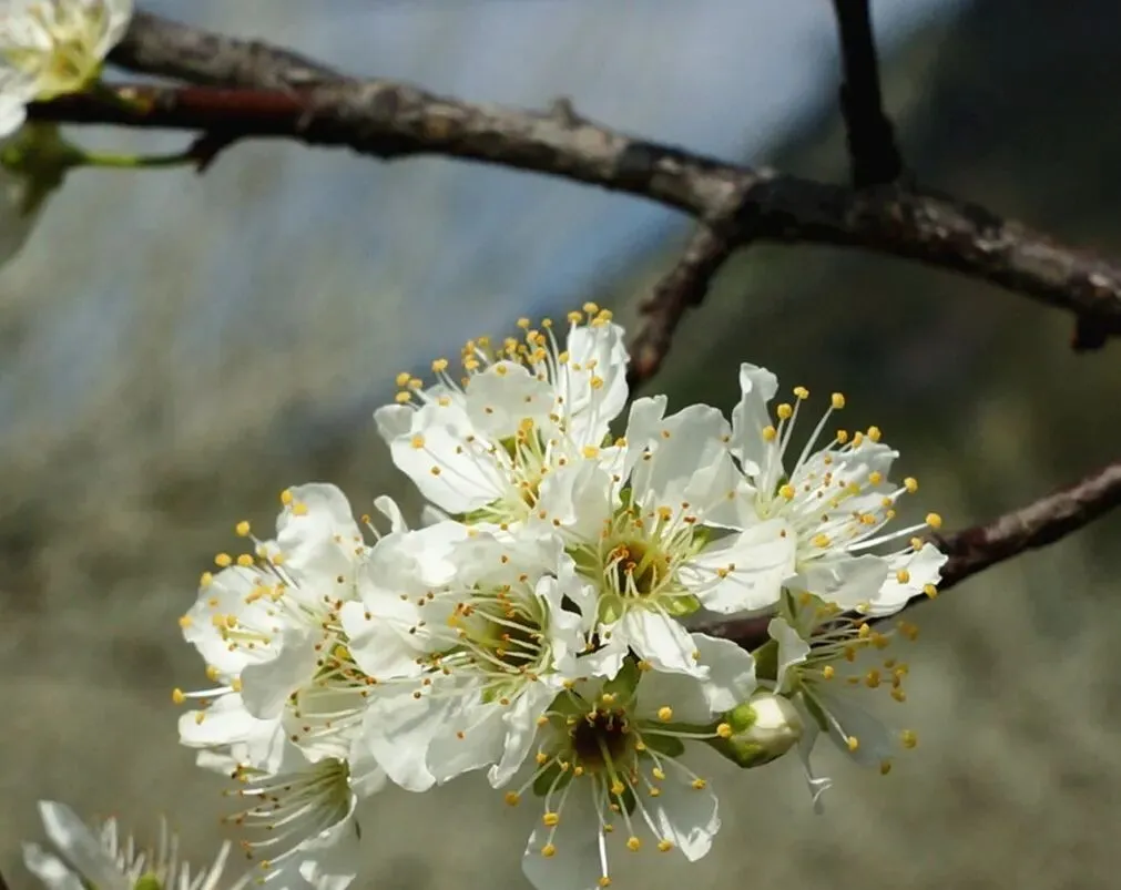 李花与梅花不同的是,粉白的花瓣透出绿气,放射出一种别样的风韵。
