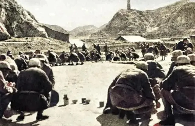1939年 , 抗大学生蹲在地上吃午饭 , 没桌子没椅子 , 饭菜也简单。 但就是这帮年轻人 , 后来撑起了一整个国家!黄河之滨集合着的 , 是中华民族最优秀的子孙。