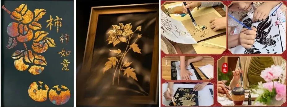 将金箔贴于特制底板上,在指尖的按压与塑形中,打造一幅金光璀璨、奢华典雅的艺术品。