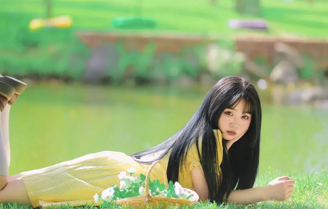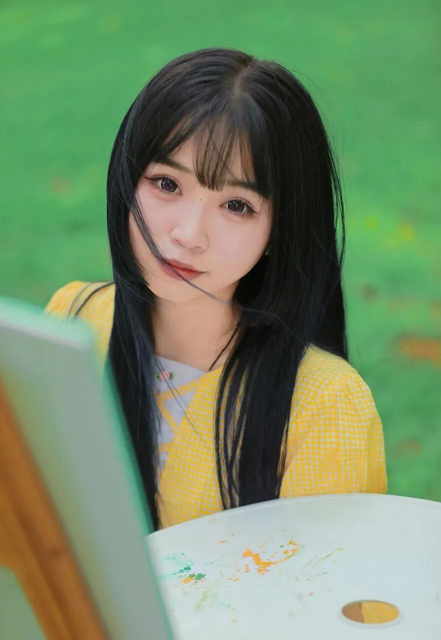 夏日,宛如一幅色彩浓烈的油画,在时光的画布上肆意铺陈。阳光如灵动的画师,用金色的笔触勾勒出世界的轮廓,而绿意则似打翻的调色盘,将大地染成一片生机勃勃的绿海。在这如梦如幻的夏日画卷中,一位身着黄色连衣裙的少女,如同一朵盛开的向日葵,带着清新与文艺的气息,出现在画架旁,成为了这夏日里最动人的风景。少女的黄色连衣裙,是夏日阳光的具象化。那明亮的黄色,仿佛凝聚了整个夏天的温暖与活力,在微风中轻轻摇曳,散发出柔和的光芒。裙子的材质轻盈而透气,细小的格纹图案为其增添了一份精致与俏皮。短袖的设计露出少女纤细的手臂,泡泡袖的元素则增添了几分复古的甜美。她双手紧紧抱着一顶浅棕色的草编包,草编的纹理清晰可见,带着自然的质朴与随性,仿佛在诉说着夏日户外的悠闲时光。她的长发如黑色的绸缎,柔顺地披散在肩头,发梢微微内扣,衬托出她精致的脸庞。齐刘海下,一双明亮的眼睛犹如夜空中的星星,闪烁着灵动的光芒。她的眼神中透露出一丝沉思与遐想,仿佛正沉浸在艺术的幻想之中。红唇轻启,带着一抹淡淡的微笑,似有千言万语,却又欲说还休。
