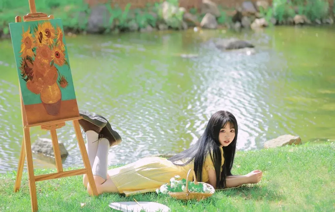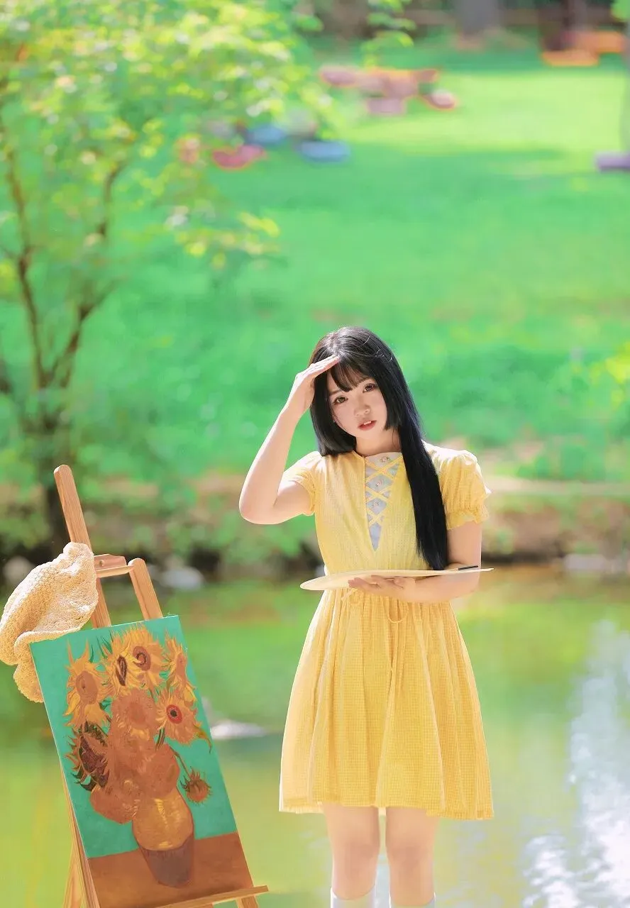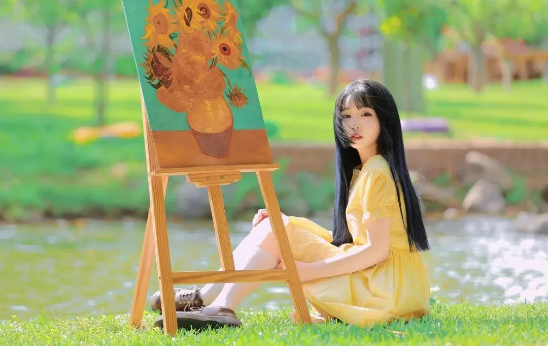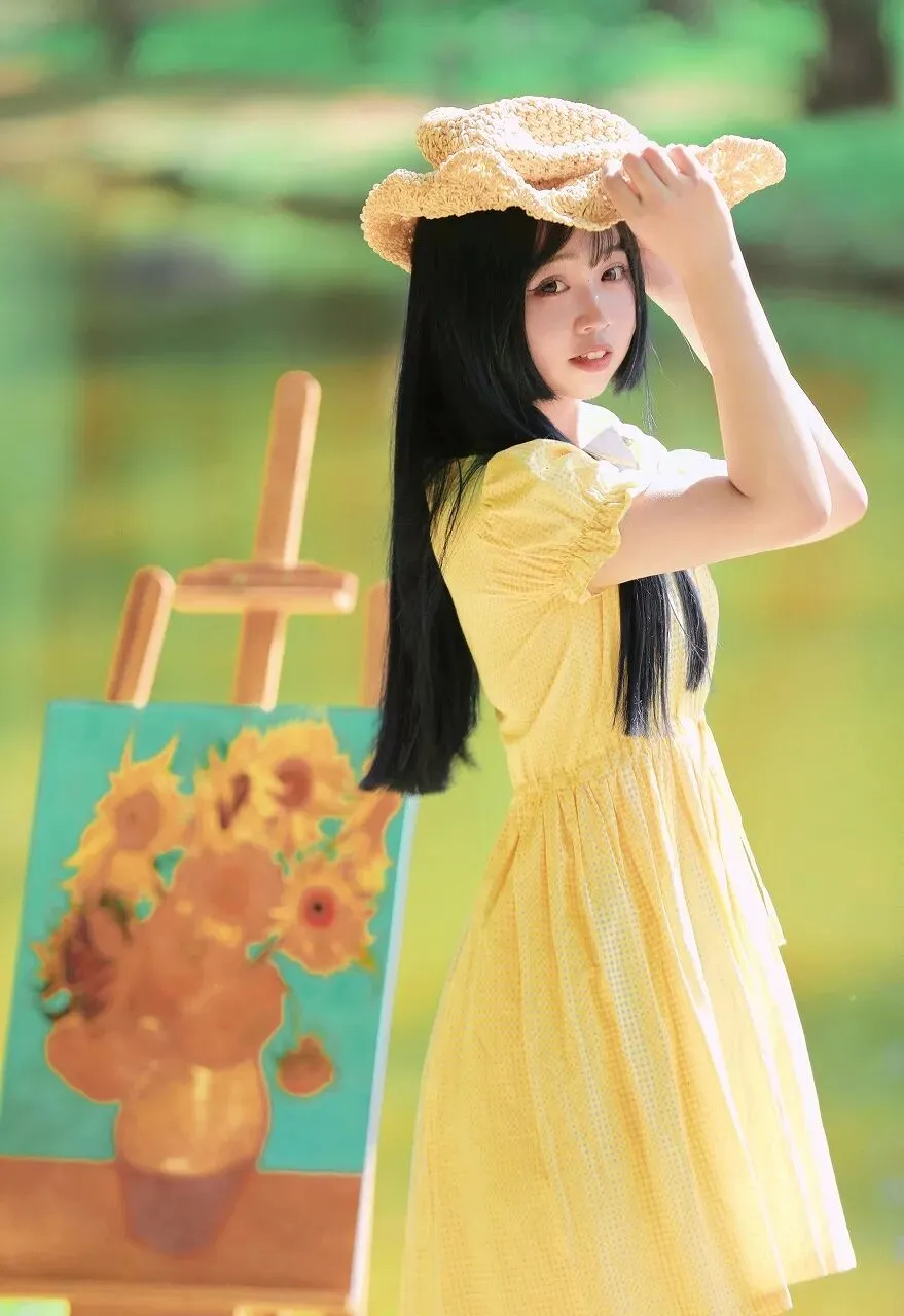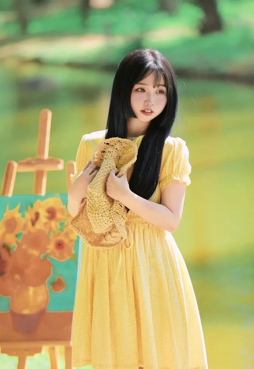 在少女的身后,一个木质画架静静伫立。画架上是一幅尚未完成的画作,画面中,几朵盛开的向日葵在棕色的花瓶中昂首挺立,金黄色的花瓣如火焰般热烈,与少女的黄裙相呼应,仿佛是夏日阳光在画布上的绽放。背景是一片绿意盎然的模糊景象,可能是茂密的树林,也可能是繁茂的草地,绿色的色调深浅不一,营造出一种梦幻般的氛围,将少女和画架衬托得更加突出。夏日,本就是一个充满艺术灵感的季节。炽热的阳光、绚烂的色彩、蓬勃的生机,都成为了艺术家们笔下的素材。而这位少女站在画架旁,仿佛与艺术有着一种与生俱来的默契。她或许是一位热爱绘画的艺术家,在这美丽的夏日里,来到户外寻找创作的灵感;又或许只是一个被夏日美景所吸引的过客,在这画架旁,短暂地停留,感受艺术的魅力。她的黄裙在阳光下闪耀,如同夏日里的一首抒情诗,诉说着青春的美好与活力。草编包则是她与自然亲近的象征,带着田野间的清新气息。她站在那里,仿佛与周围的环境融为一体,成为了夏日艺术画卷中的一部分。