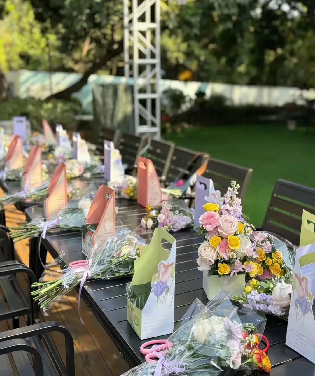 提前布置场地。用当季的樱花、郁金香、翠珠等富有春日气息的花材做大型桌花。音乐选轻柔的钢琴曲或自然白噪音。灯光务必温暖明亮,方便大家拍照。一个小小的签到桌,用鲜花和黑板画装饰,每位来宾都能拿到一张手写姓名卡,仪式感从这里开始。