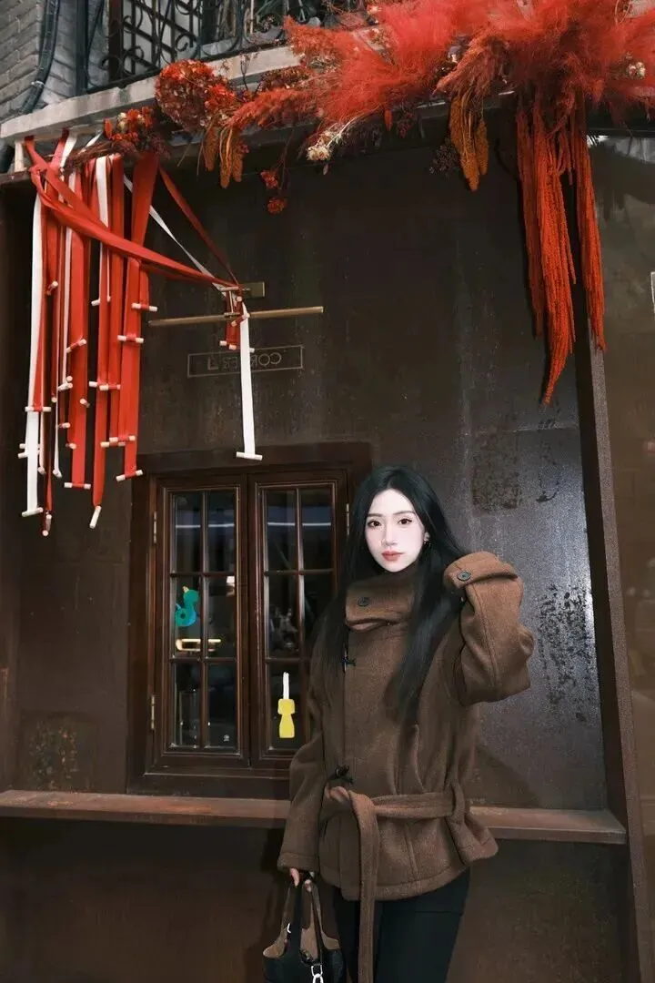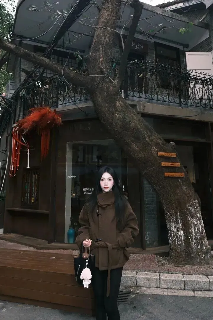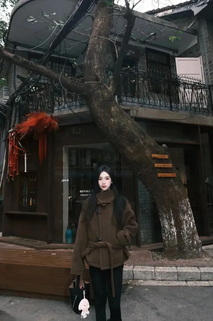 .门街拍的.时候,.这件.大衣.特别上.镜。找个小.街巷,背景.有点老.建筑,随便.一站就.是大片感。模.特小姐.姐站在一.棵大树旁边,.身姿挺拔.,眼神里带着.点故事感。深.棕色大衣和灰.墙旧瓦配在.一起,氛围.感直接拉满。.她把手插进.口袋.,微微.侧身,.那种随性的.劲儿特别.迷人。包包.自然垂.着,一.点不刻意.
