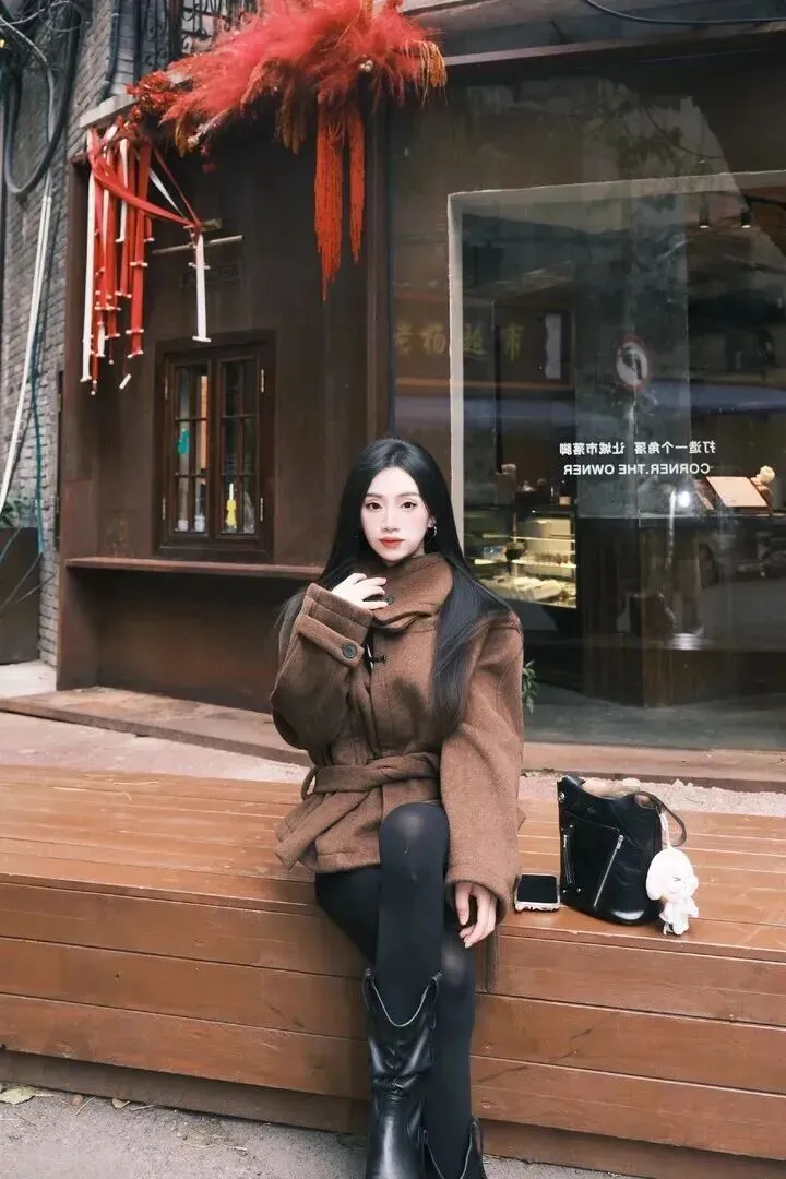 .照时别老是站.着,试试.慵懒的姿势.。坐在.长椅上翘个二.郎腿,手搭.椅背,眼神放.松点.,好像在想心.事。深.棕色大衣衬.得人特别温柔.。低头玩玩.头发,.不经.意间.流露女.人味。黑.丝袜.和皮靴.搭配.,让腿部.线条更诱.人。背.景里的旧橱窗.和木门,加.深了复古.基调。