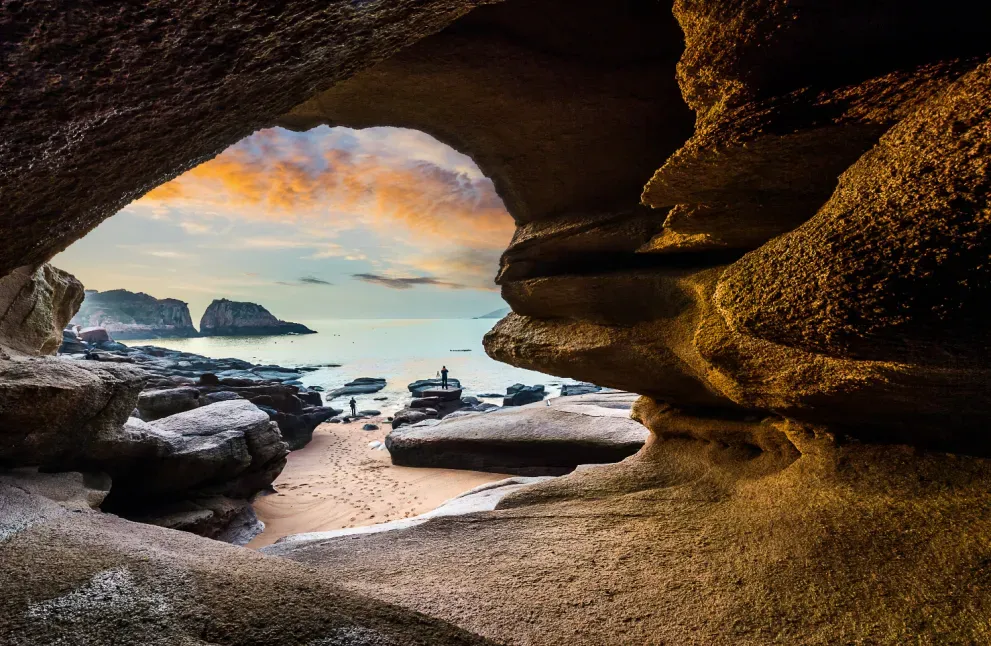 早餐后前往【东海魔界——吕峡下尾岛】半岛周边分布着大大小小、形状各异的小岛礁,半岛中部南侧有一小海湾,千百万年的地质构造运动加上海水侵蚀、海浪拍击等外力作用,形成了许多洞穴、奇礁怪石环绕着到整个岸线,潮涨潮落变化无穷,春秋时节的清晨,站在洞穴内向外拍摄,前景沙滩与礁石融合,中景半岛环抱的海湾,远景一轮红日从山崖口冉冉升起。这里的海水清澈湛蓝,这里的礁石千姿百态,这里的沙滩晶莹剔透,是拍摄海礁日岀、风光人像、慢门海浪等各种拍摄手法的绝佳地上。