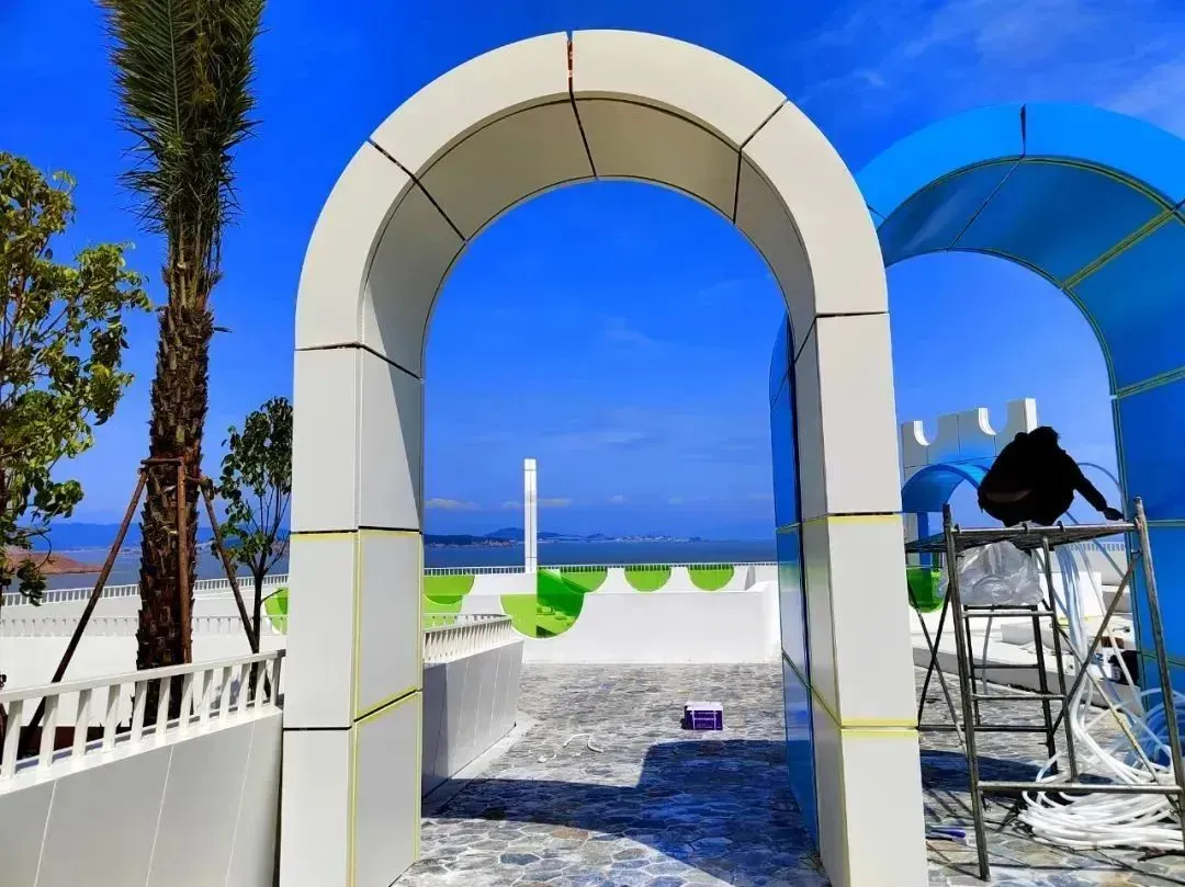 海尾城堡由蓝、白、绿三种颜色组成,五彩缤纷的城堡,视觉冲击很强。置身城堡,眼前是一望无际的大海,身后绿树成荫,芳草萋萋,让人仿佛来到童话世界。