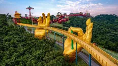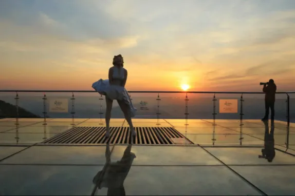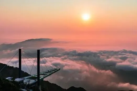 水晶廊桥全长82米,全透明玻璃桥身,行走其间如同凌空漫步、踏云破雾。