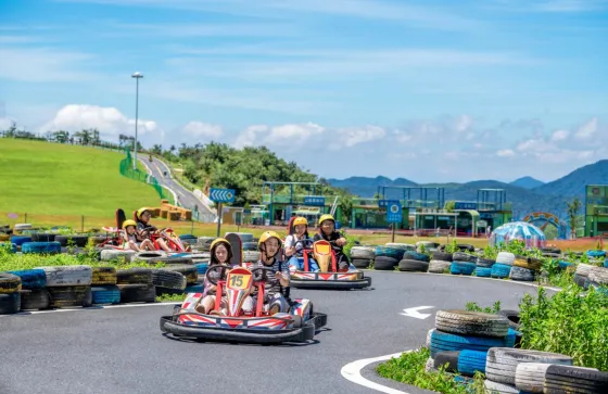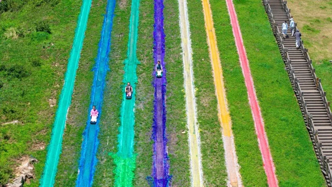 网红项目彩虹滑草高整个约100米长,40°倾角,从七彩滑道上飞速而下,尽情享受速度与乐趣,一路滑下来只需20秒。