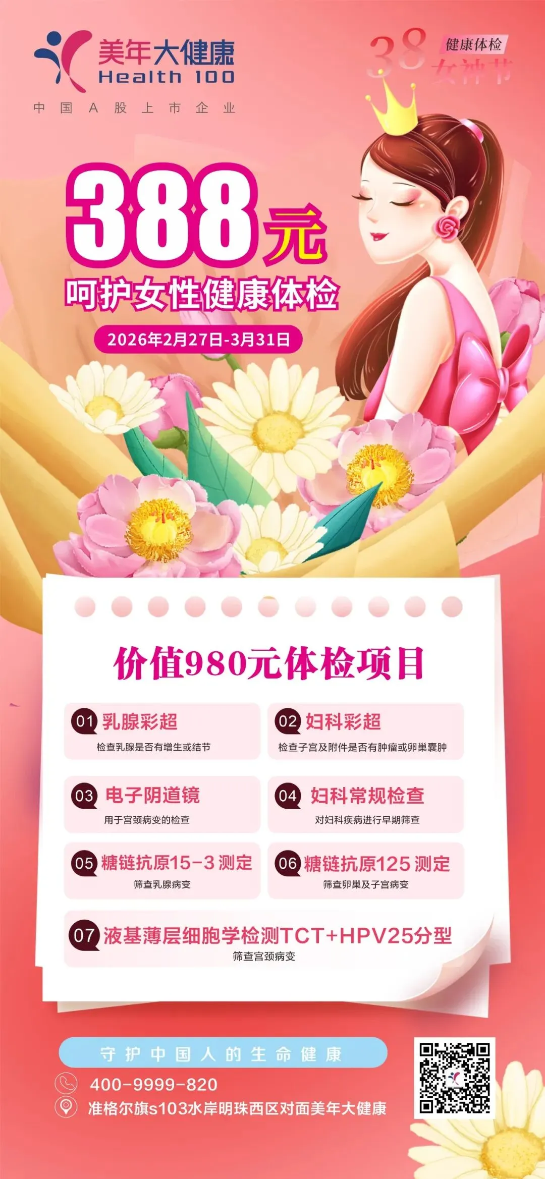 当前位置:首页>美女资讯>【38女神节】388元呵护女士健康体检套餐