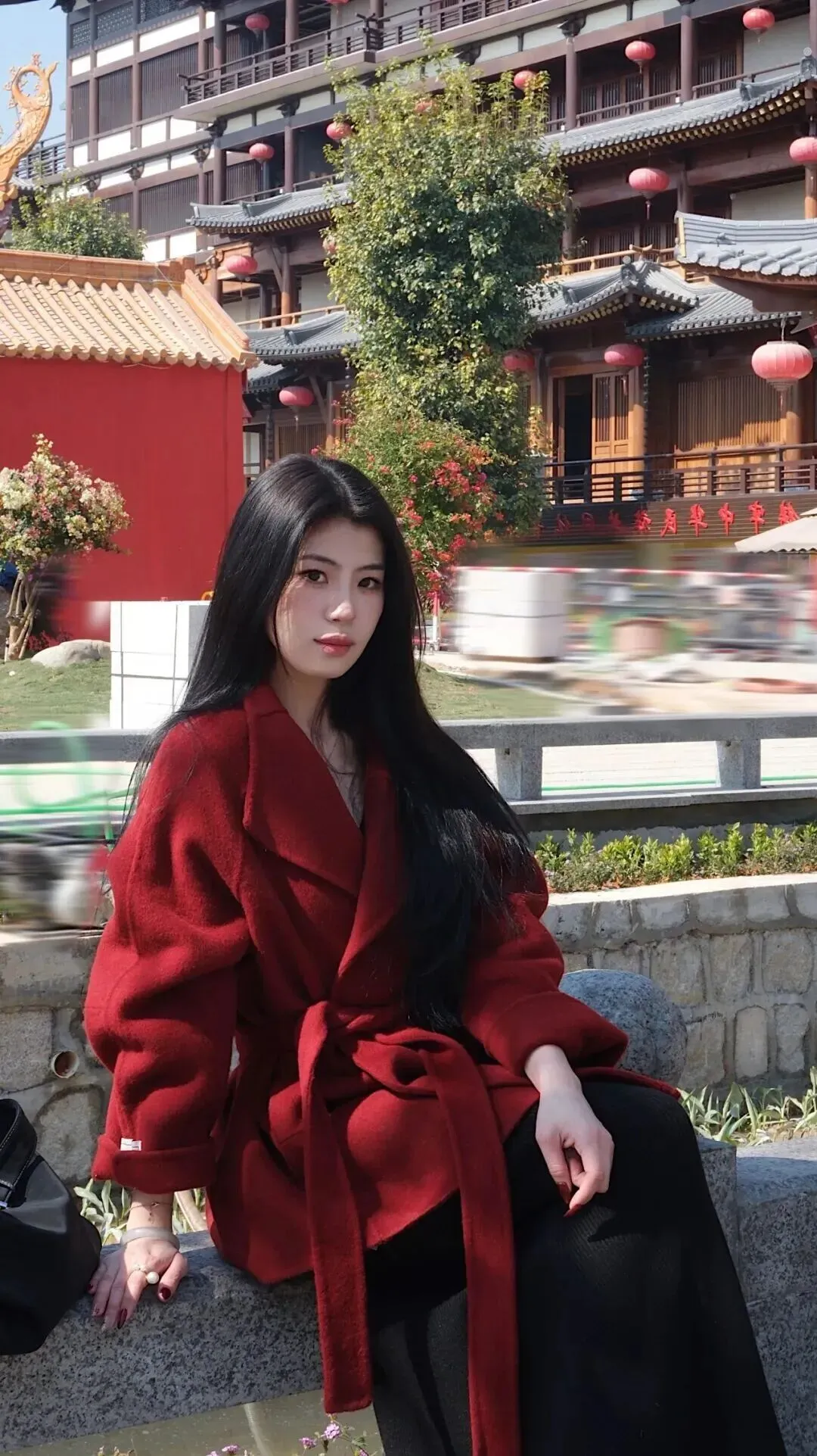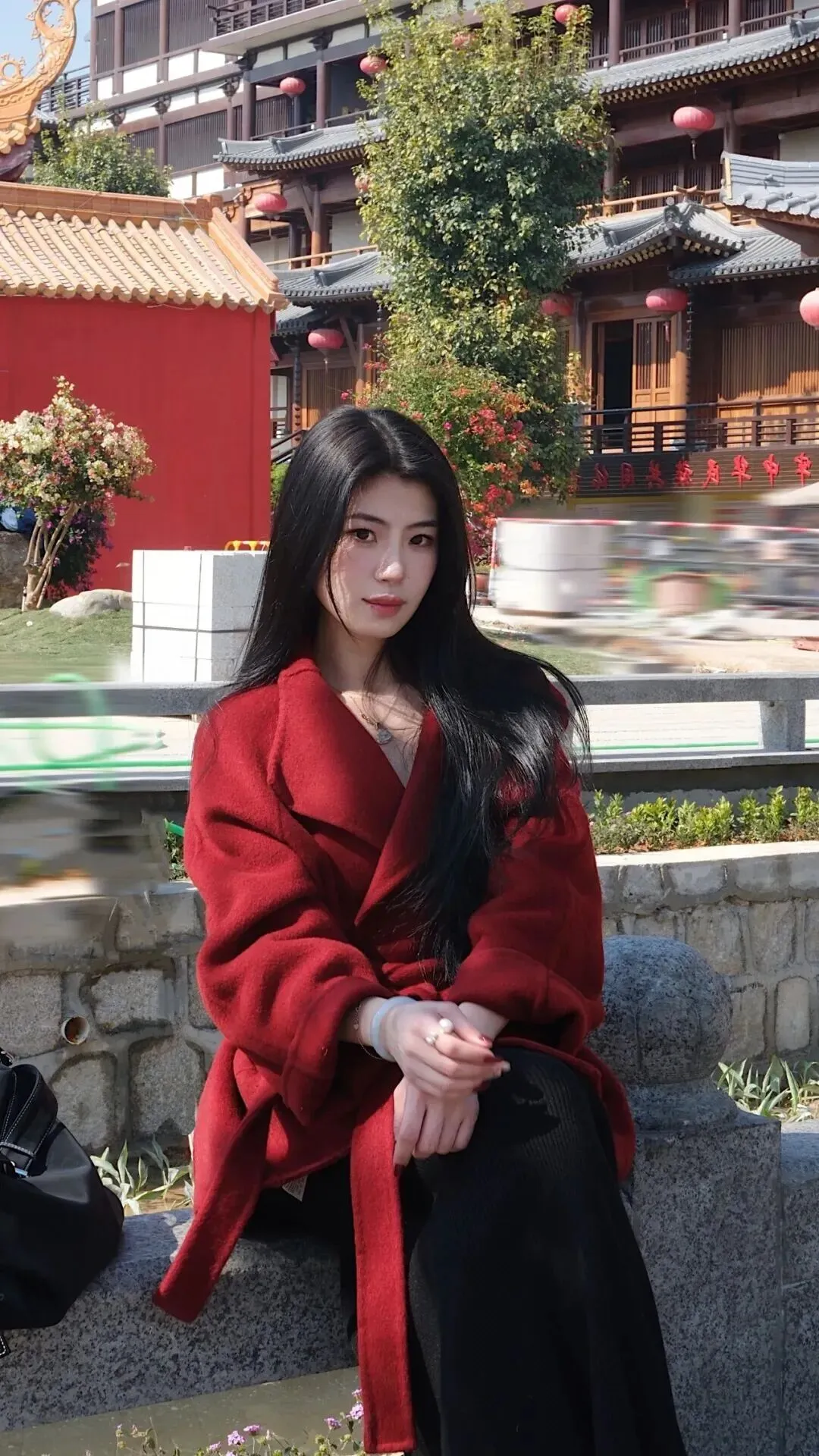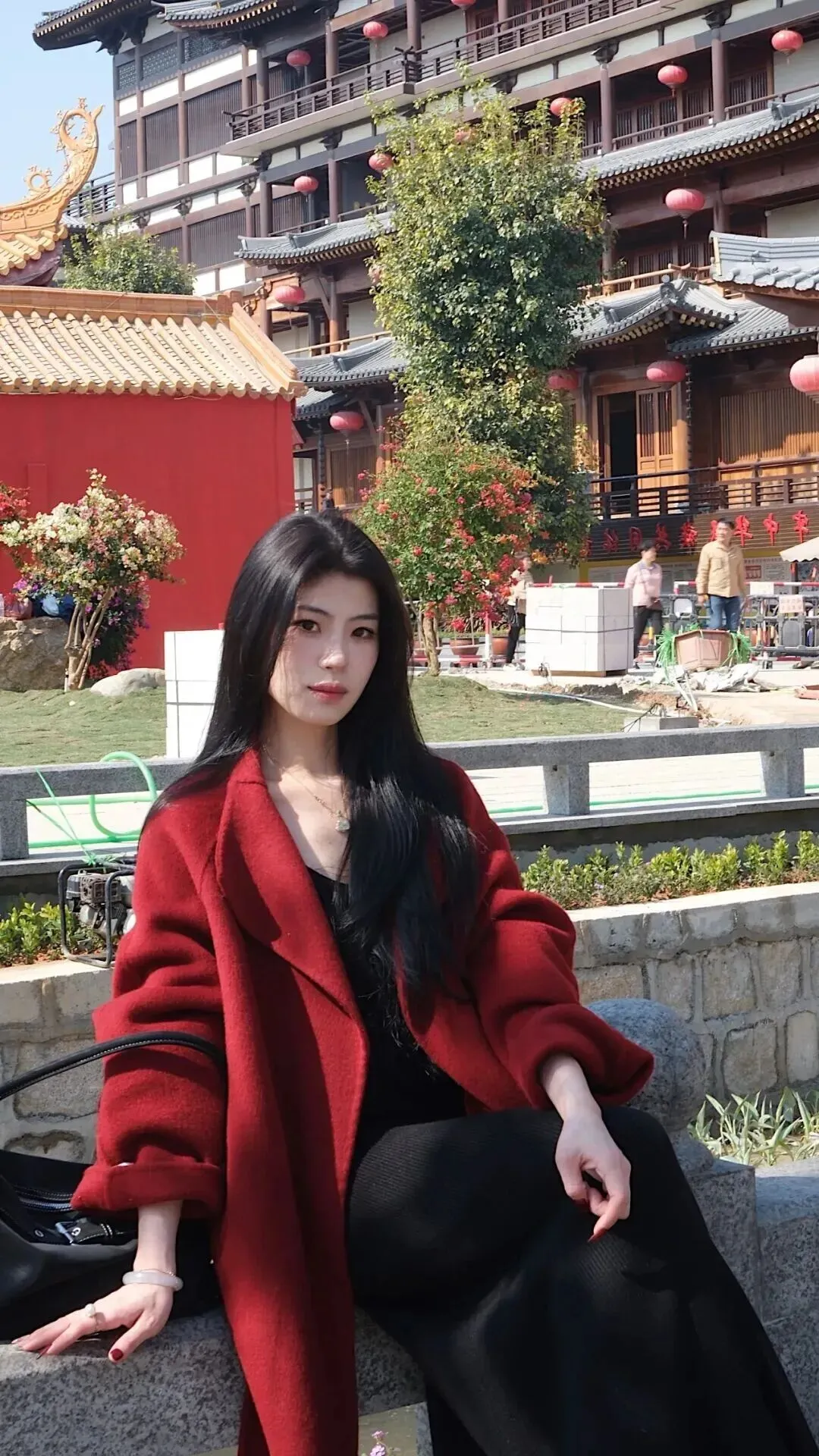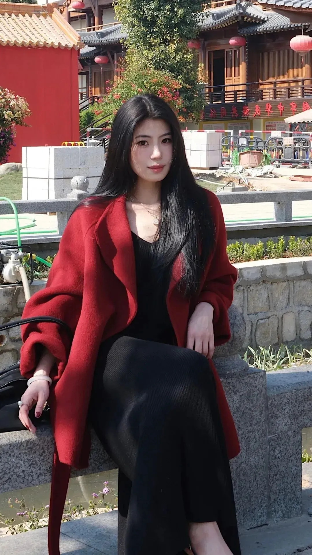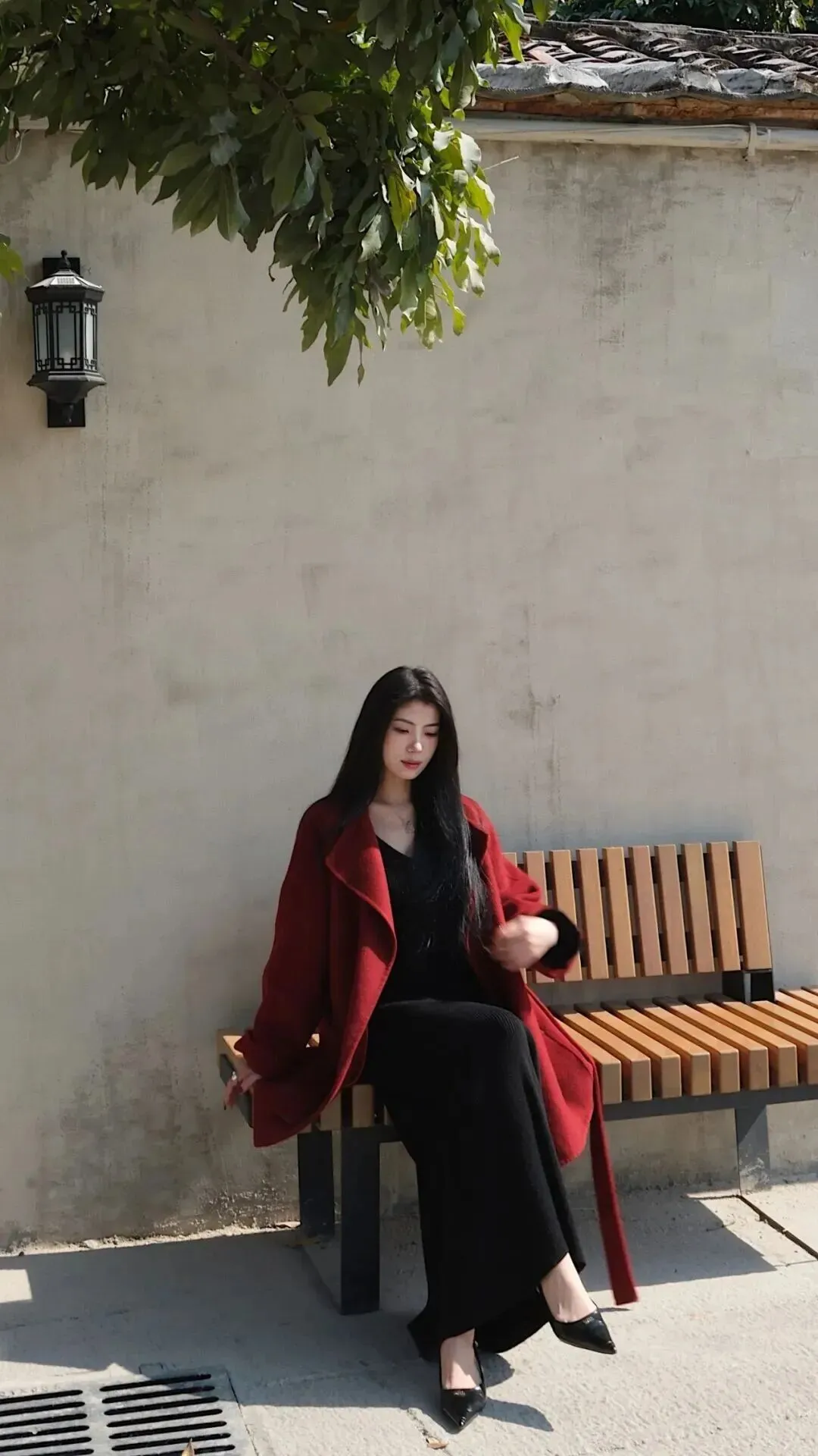 这套.衣服妙就妙在.哪儿都能.穿。现代商场.里走着是都市.丽人,到了.古建筑前面居.然也.毫不违和。酒.红墙壁.和衣服颜色相.映成.趣,黑色.在木质背.景前更显沉稳.,拍照.特别出片。