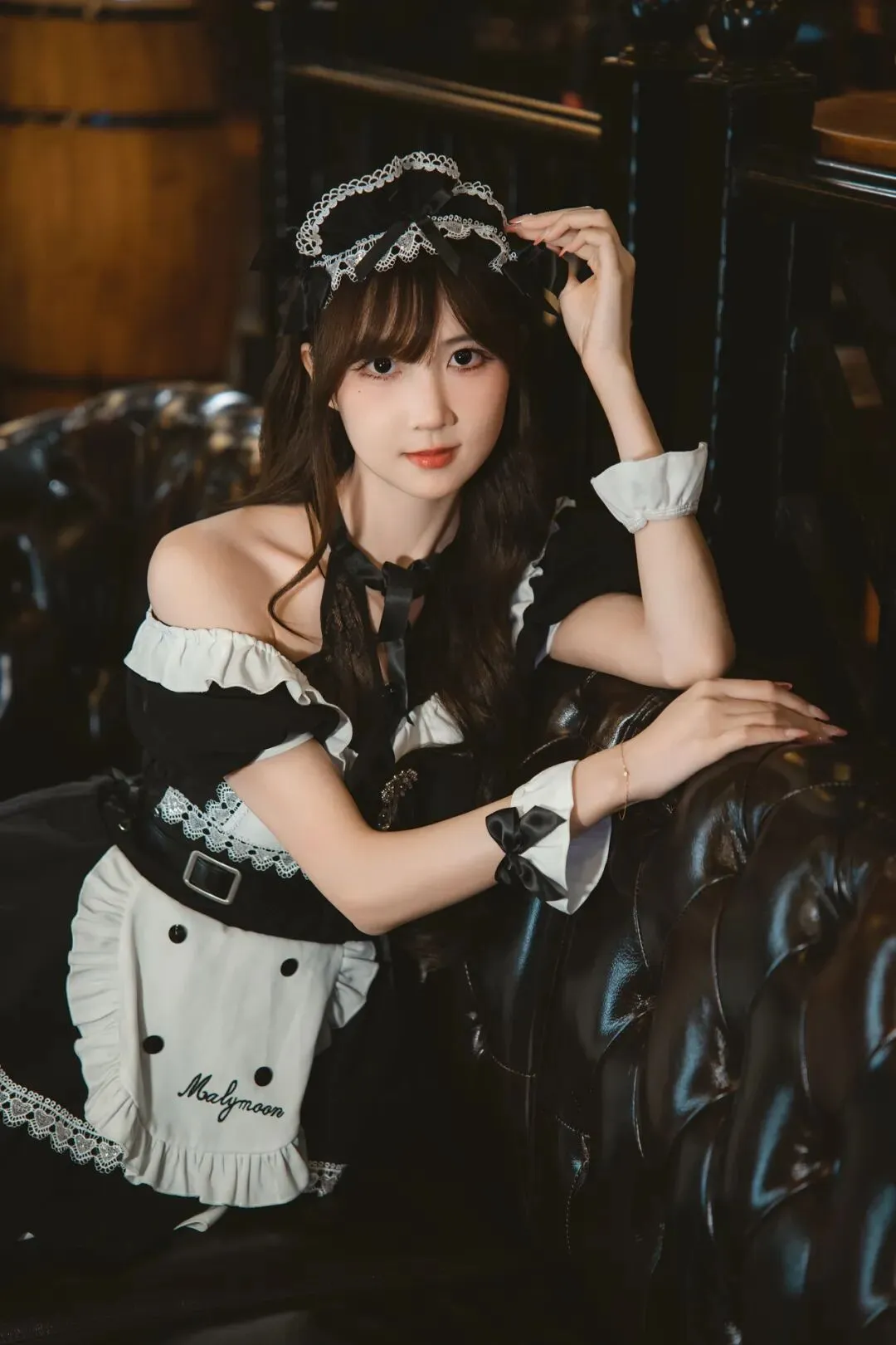 侧身靠在沙发扶手上,一手轻扶沙发,一手托着女仆帽,身体微微侧转,背景是复古酒桶,显温柔又上镜。