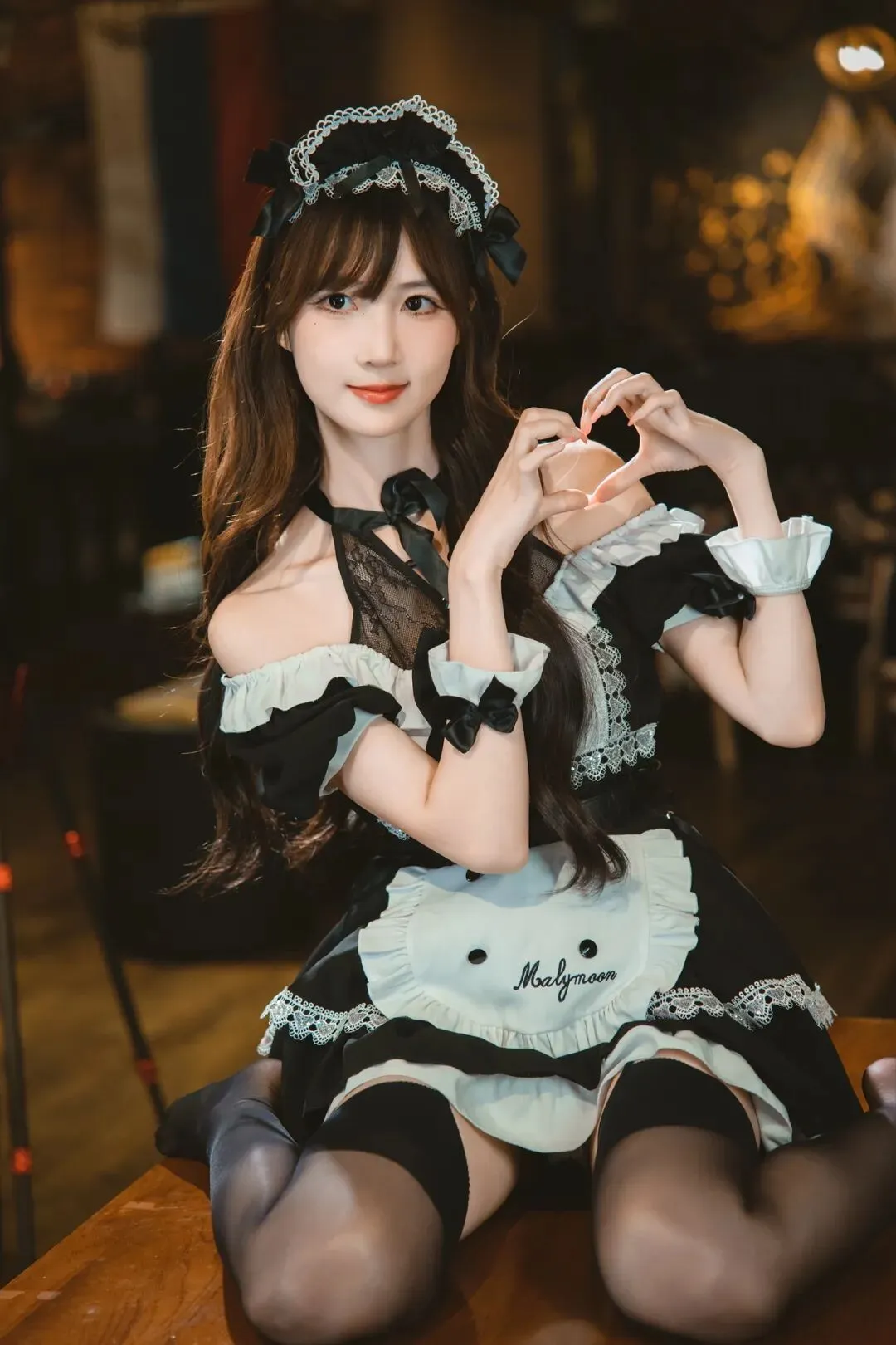 侧身坐在吧台上,双手比心,一手托着小杯子,身体微微侧转,背景是酒吧吧台,姿势俏皮又有细节,显耐看又有个性。