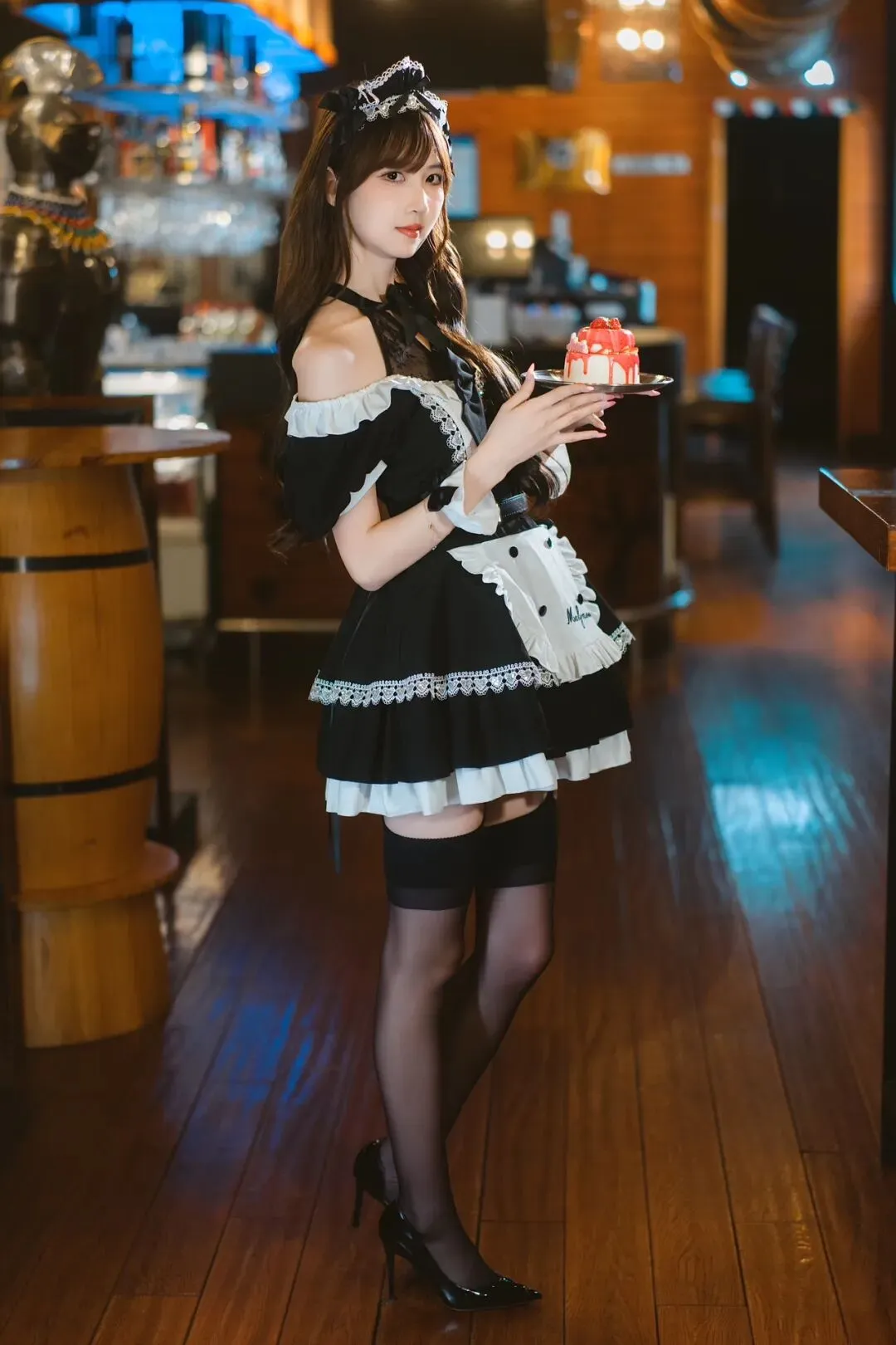 双手托着小蛋糕,身体微微侧转,背景是木质吧台,姿势端庄又可爱,显元气又治愈。