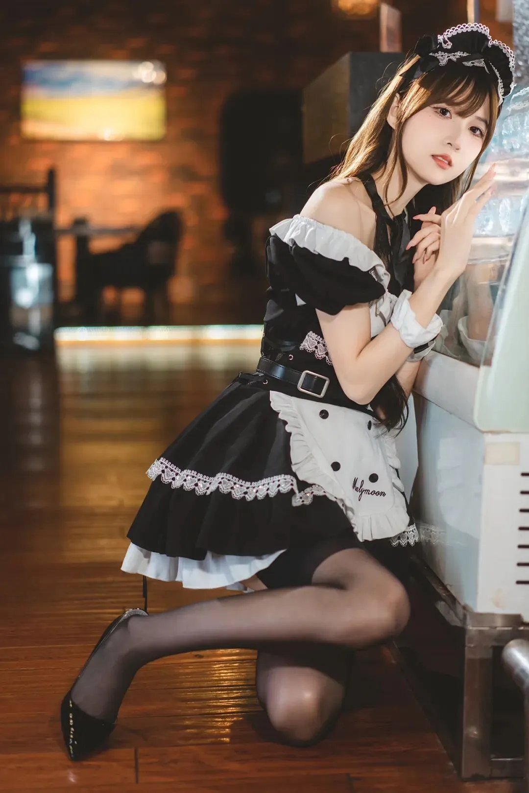 单膝跪在冰柜旁,双手轻扶柜门,身体微微侧转,背景是酒吧走廊,姿势松弛不刻意,像在和镜头互动。