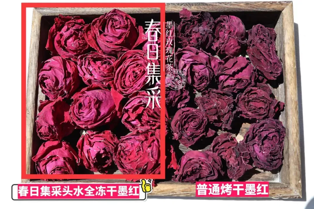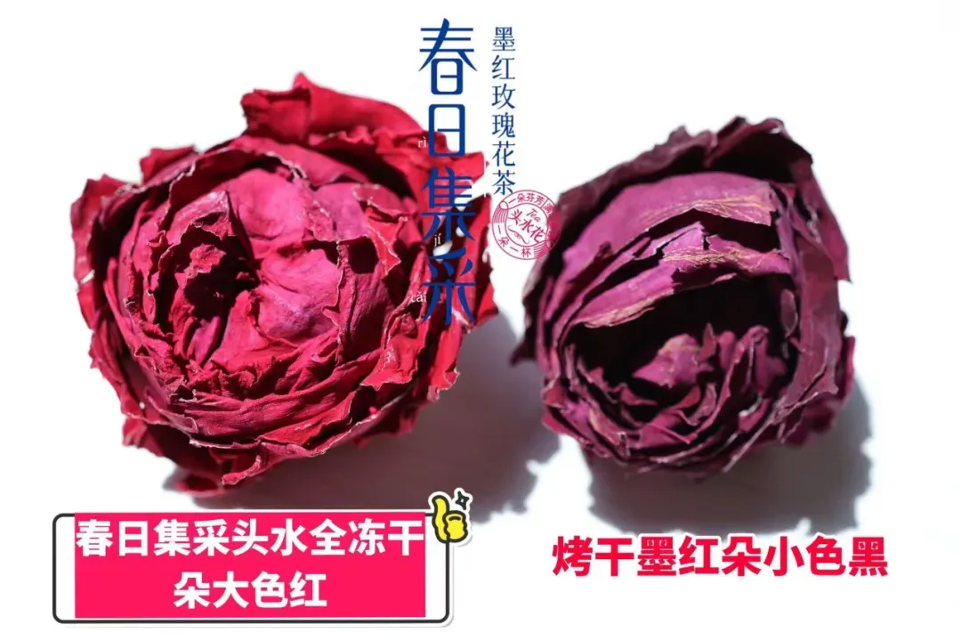 春日集采头水全冻干,花朵大,颜色正VS烤干花,花朵小,颜色暗。